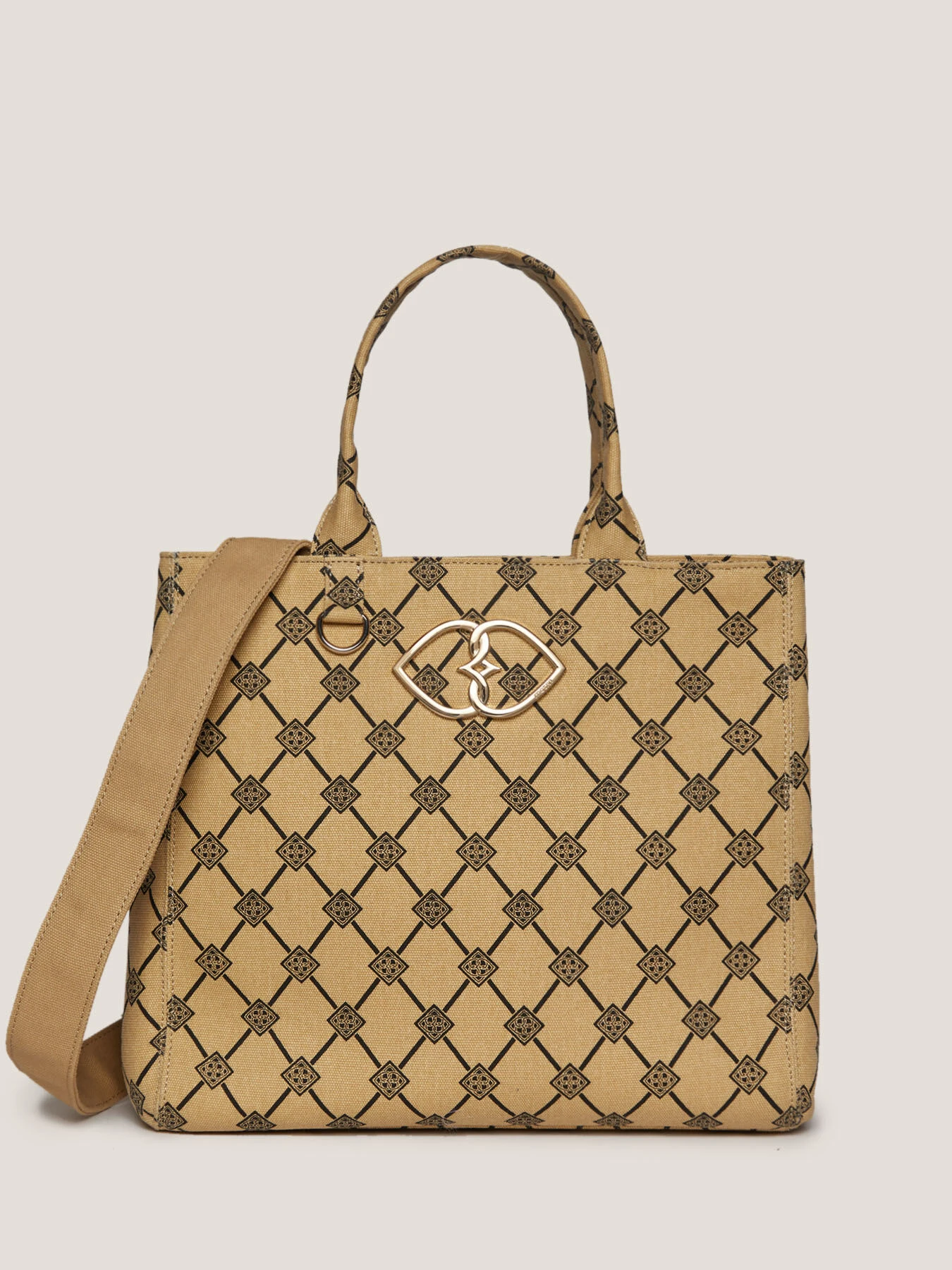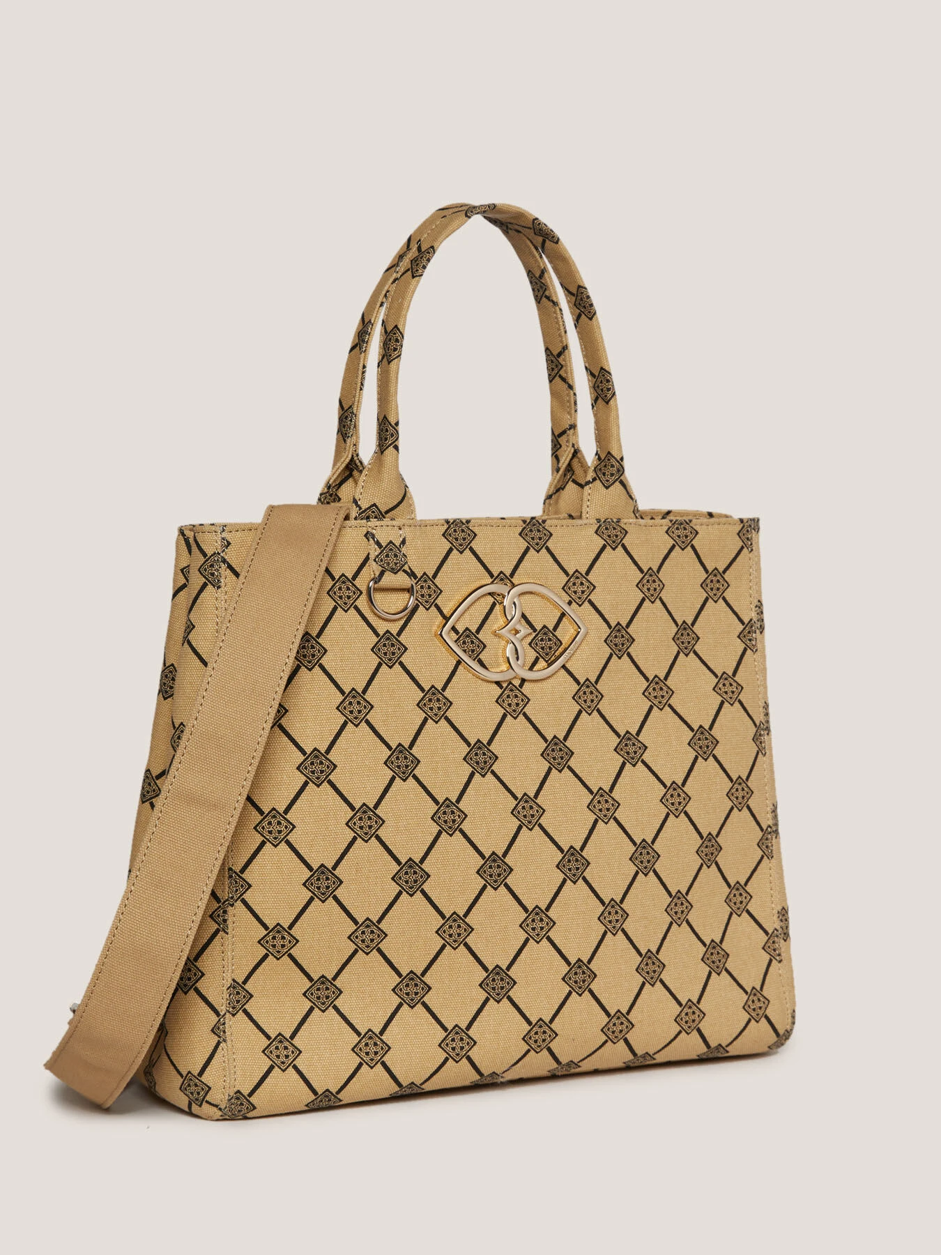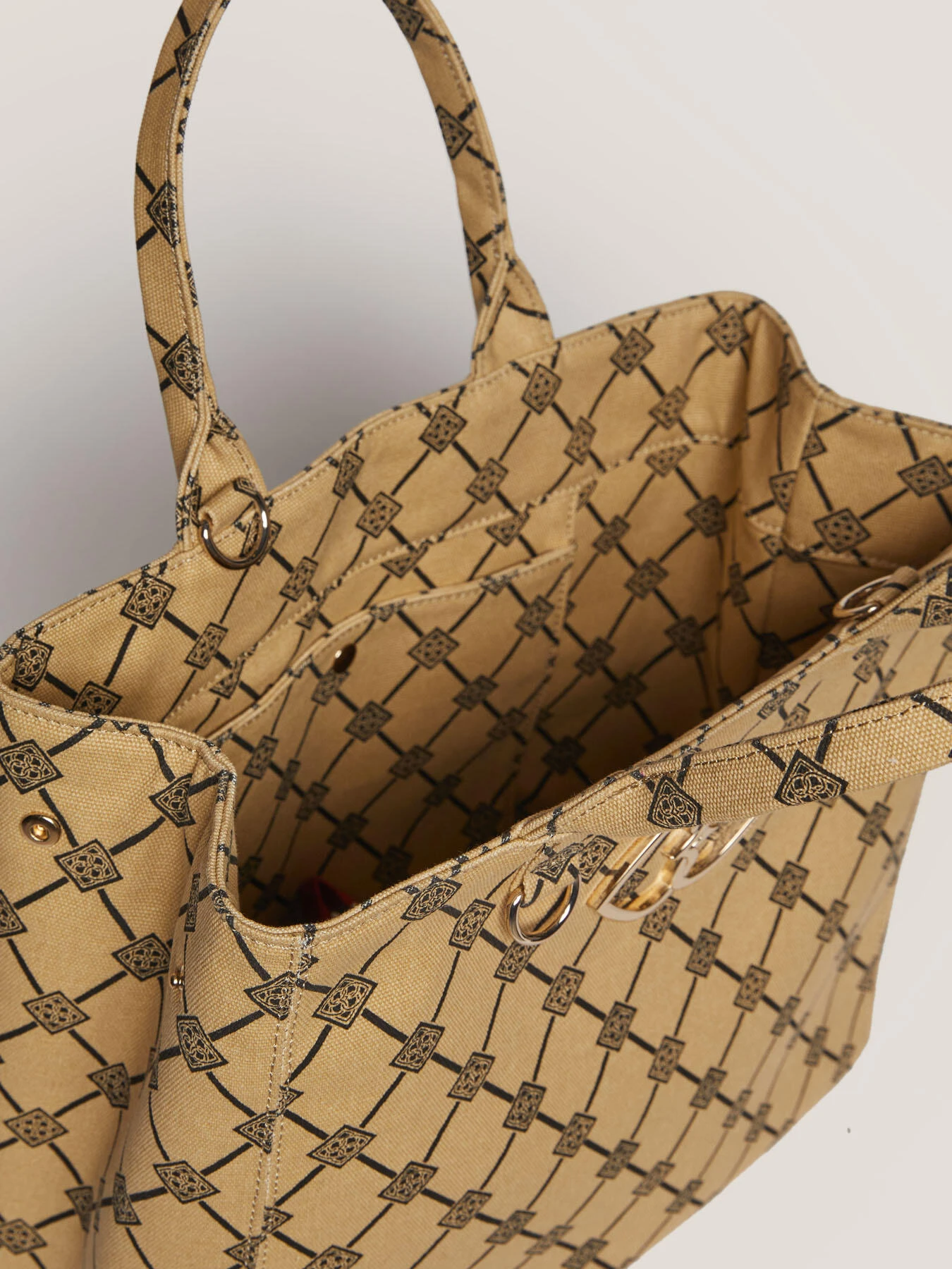 Tote bag in cotone stampato; tracolla regolabile in canvas unito, placca metallica Double Love, tasca interna; dimensioni: altezza 33 cm, larghezza 32 cm, ampiezza 12 cm.