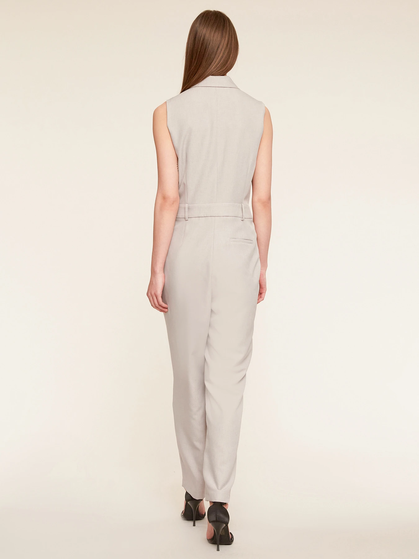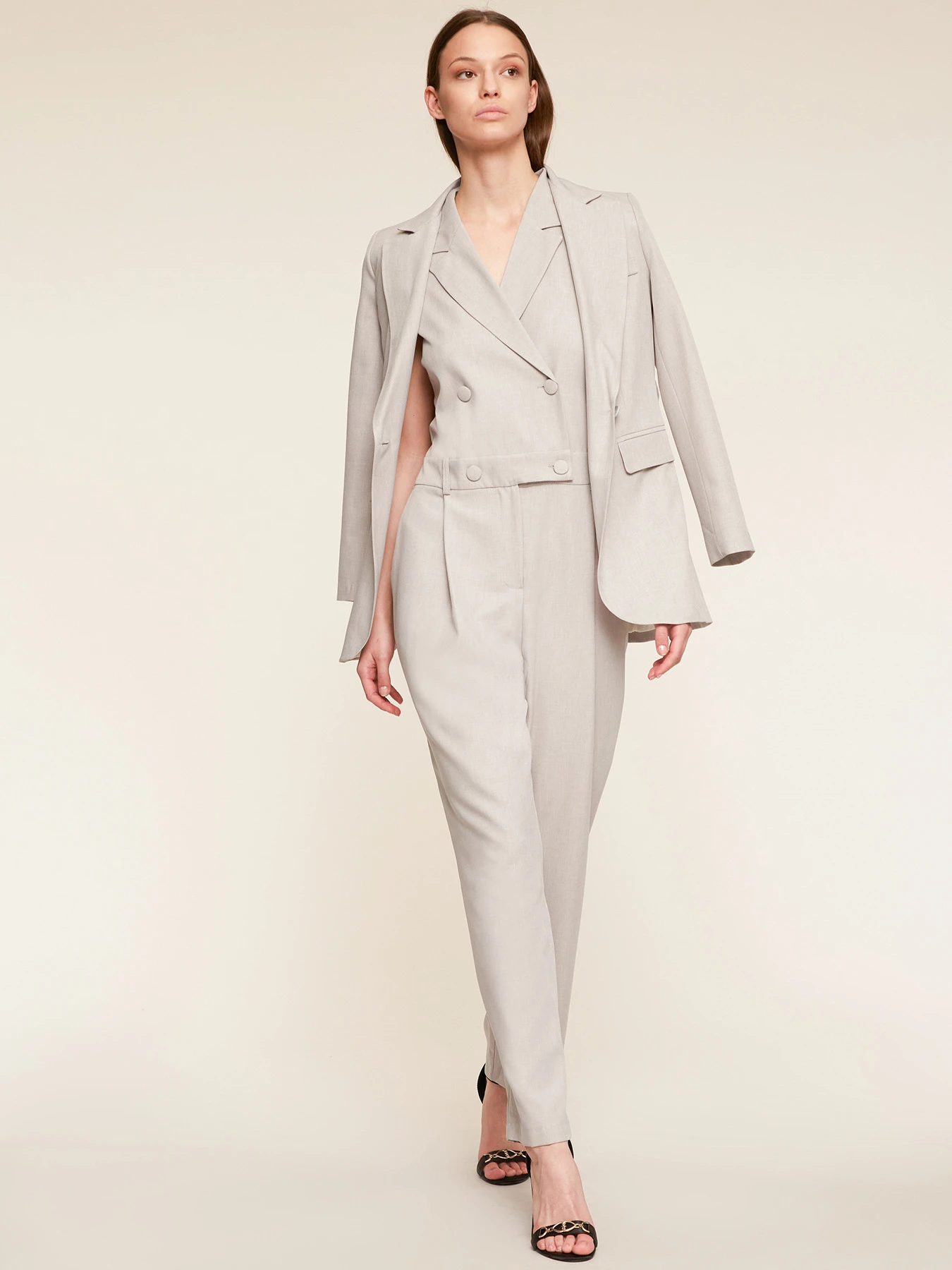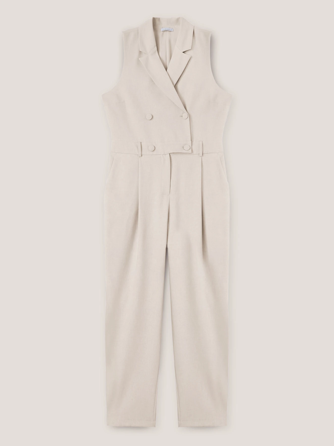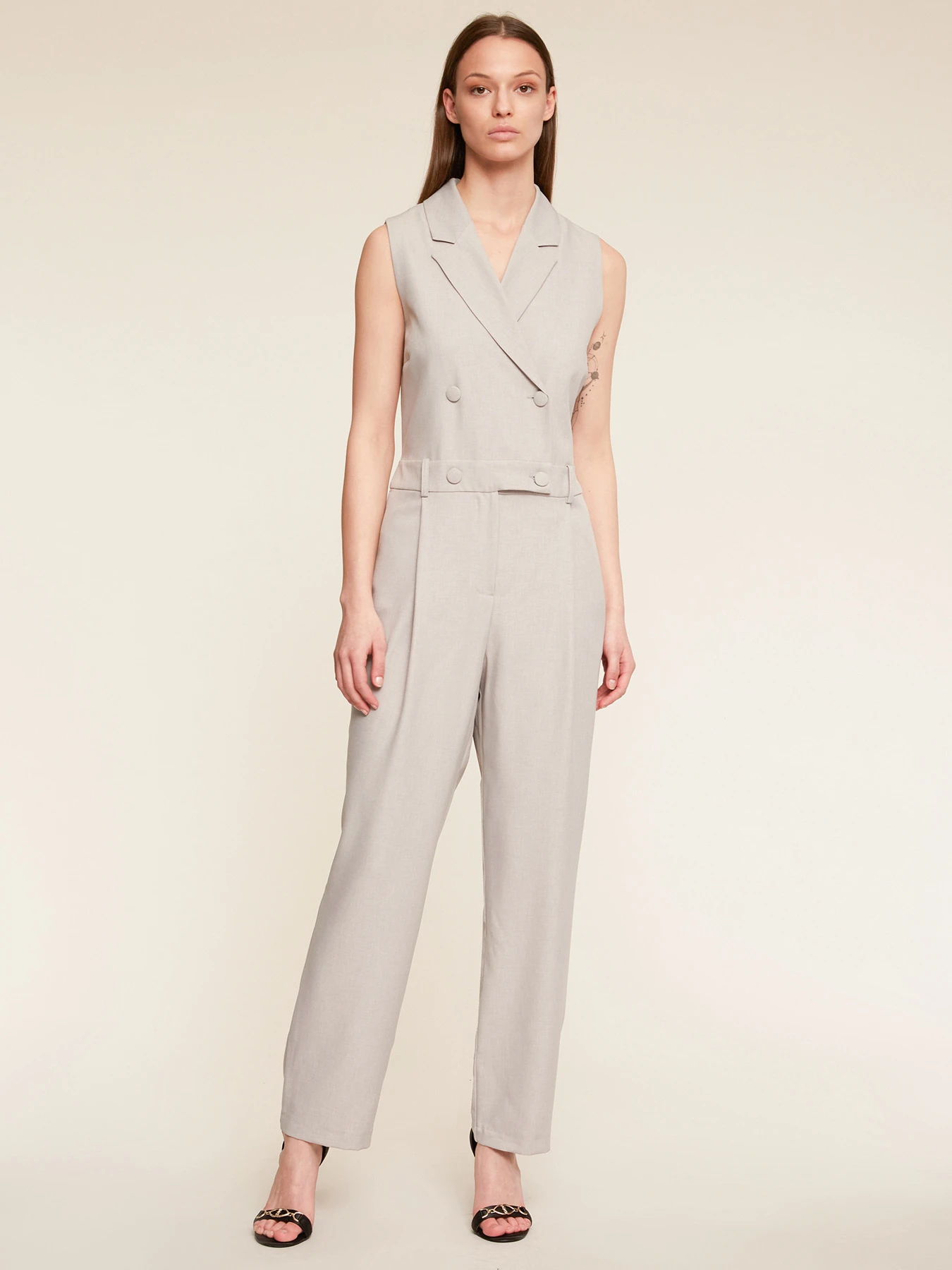 Tuta lunga doppiopetto in tessuto formale tinta unita; chiusura frontale con colletto a revers e bottoni foderati; modello senza maniche, tasche all’americana inserite nel fianco. MADE IN ITALY