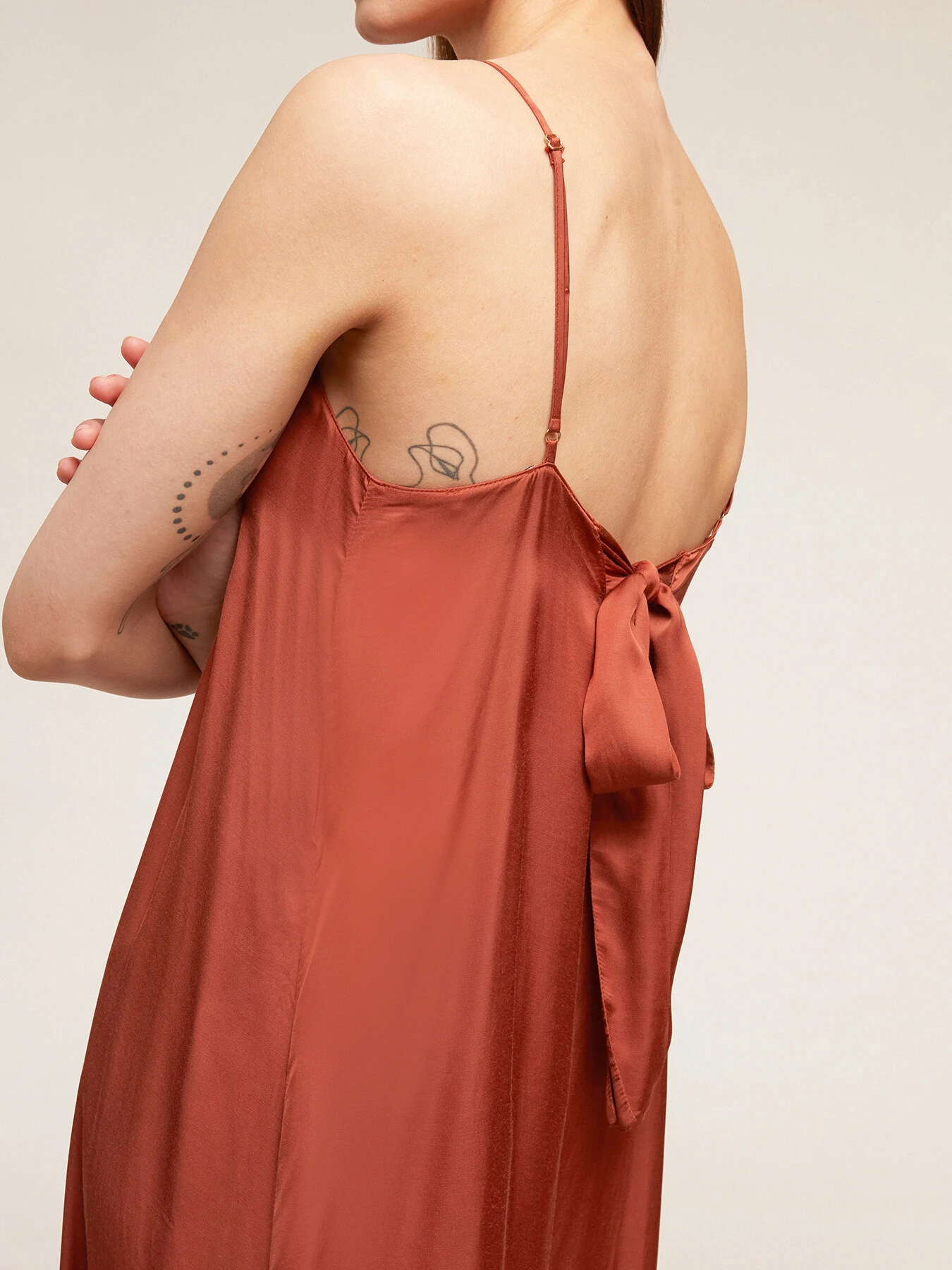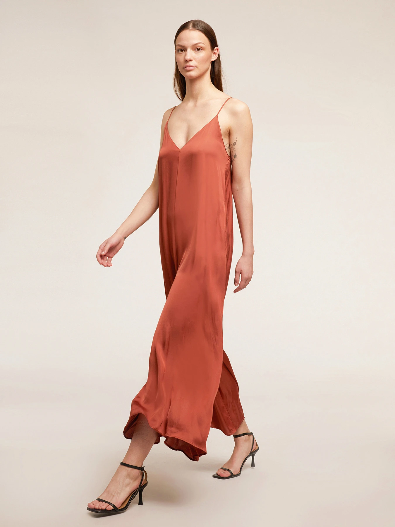 Tuta lunga in raso di viscosa tinta unita; profondo scollo a v frontale e spalline fini regolabili; motivo nastri da annodare sulla schiena; gamba palazzo, vestibilità over.