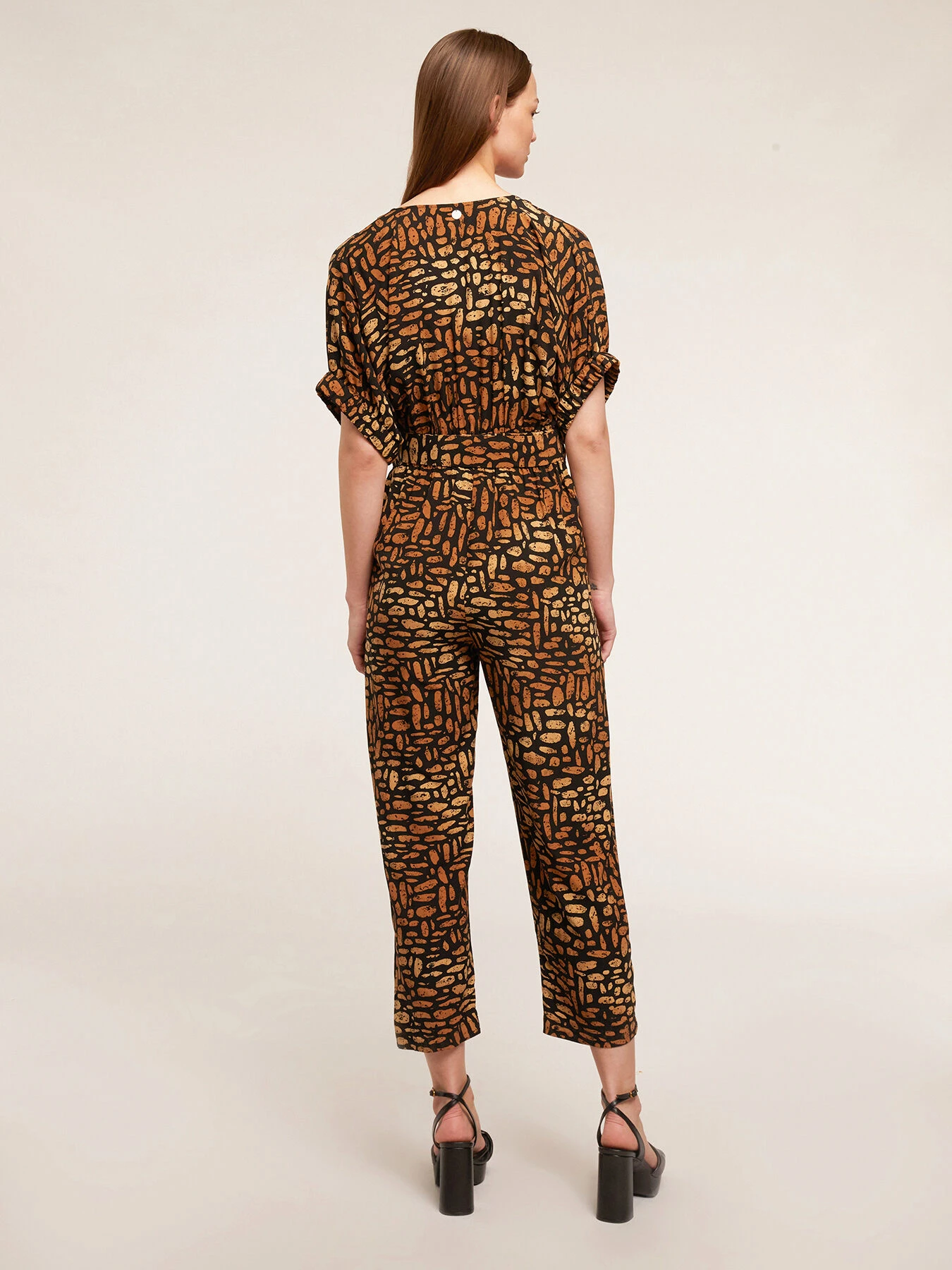 Tuta lunga in viscosa fantasia etnica; chiusura frontale con scollo a v e bottoni a vista effetto madreperla; maniche corte con elastico sul fondo, cintura in vita tono su tono; pantaloni gamba carrot con pieghe.