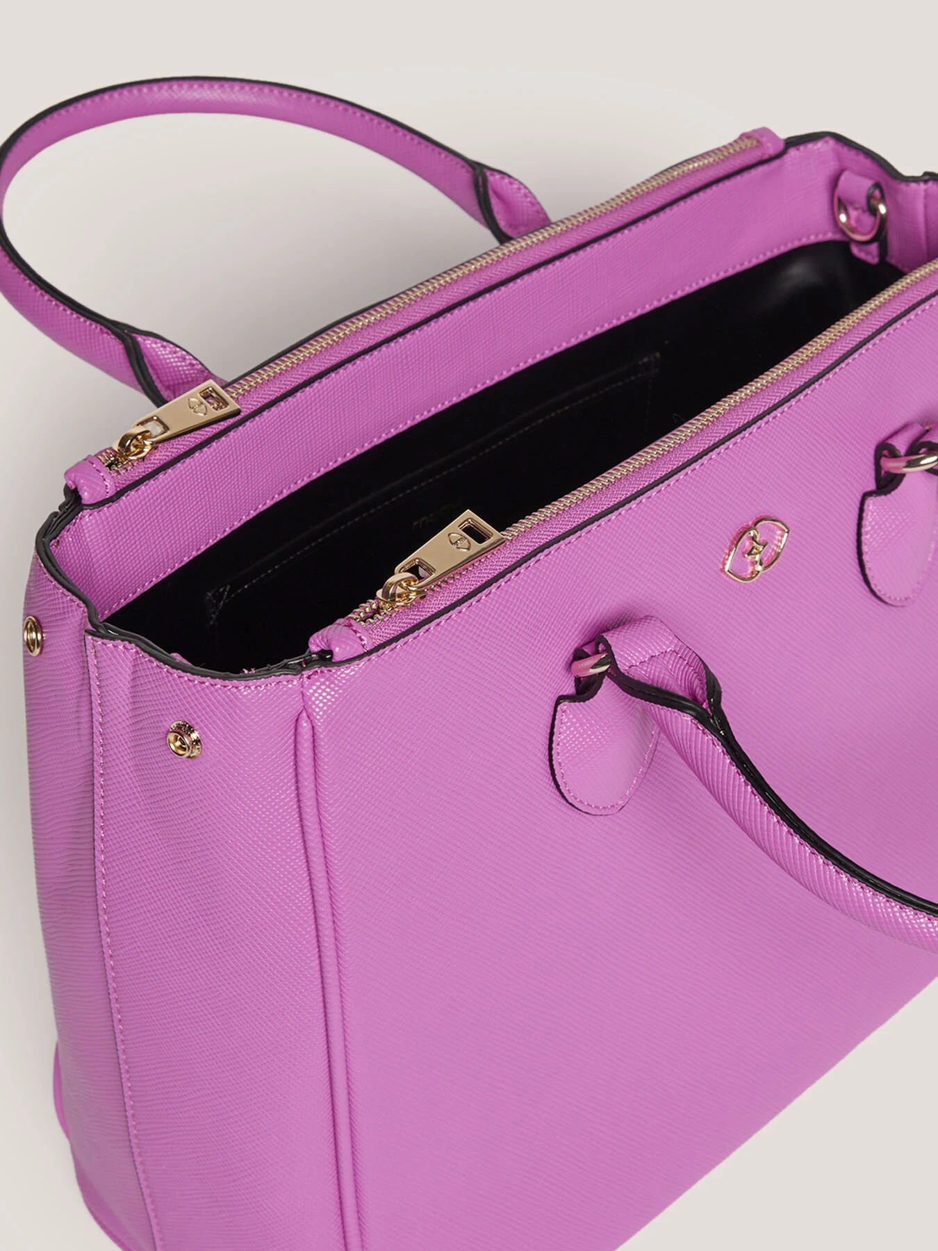 Utility Bag in similpelle effetto saffiano; doppi manici e tracolla regolabile tono su tono, doppio vano chiuso da zip, tasche interne; dimensioni: altezza 24 cm, larghezza 32 cm, ampiezza 13 cm.