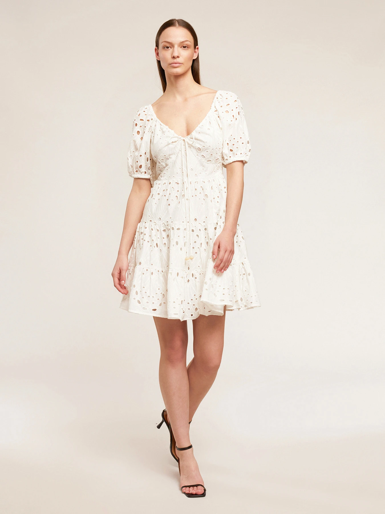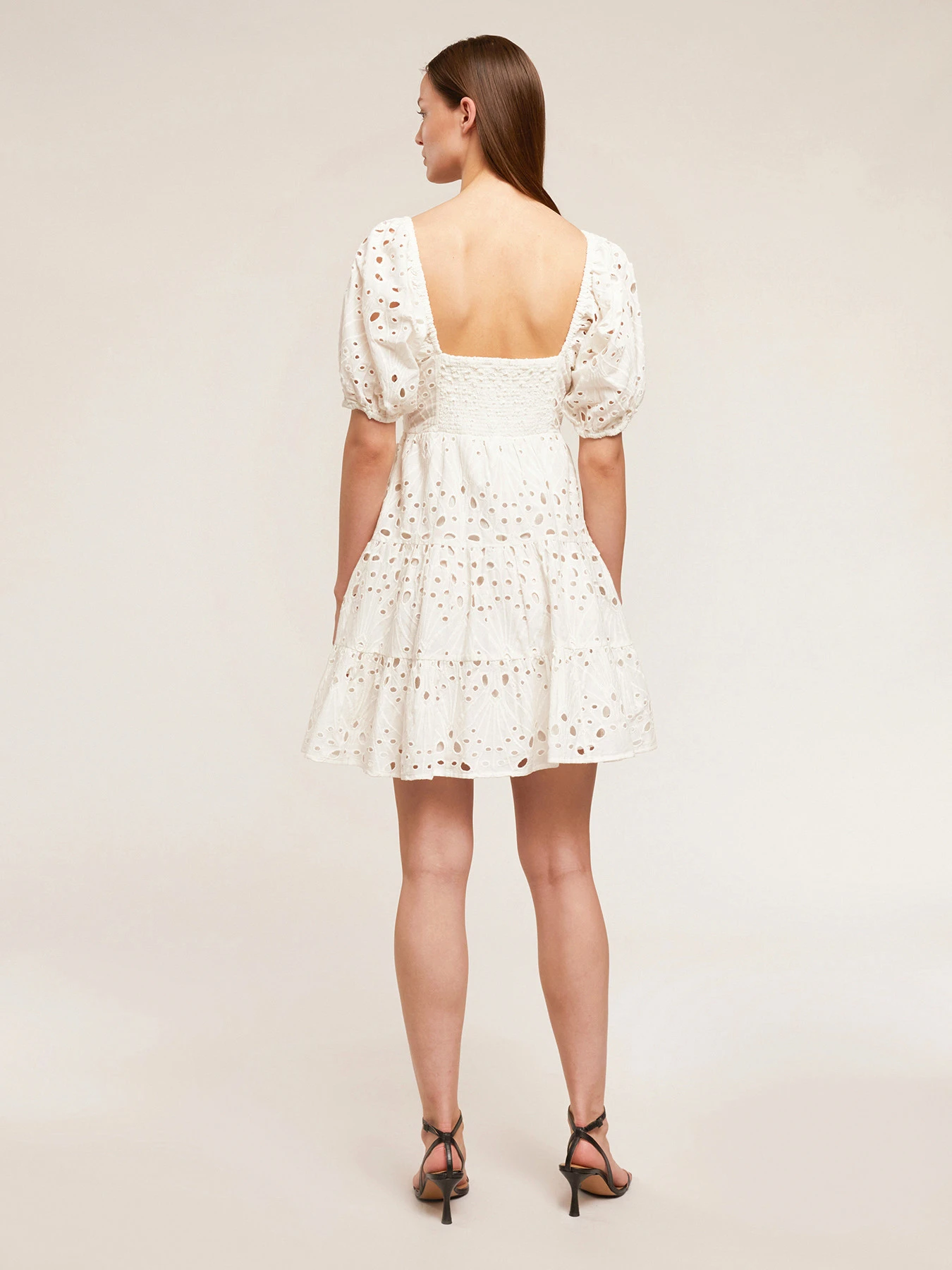 Vestito a balze in pizzo sangallo con fodera interna; corpino con ampio scollo frontale e impunture elastiche posteriori, maniche corte a palloncino; modello a balze con fondo svasato.