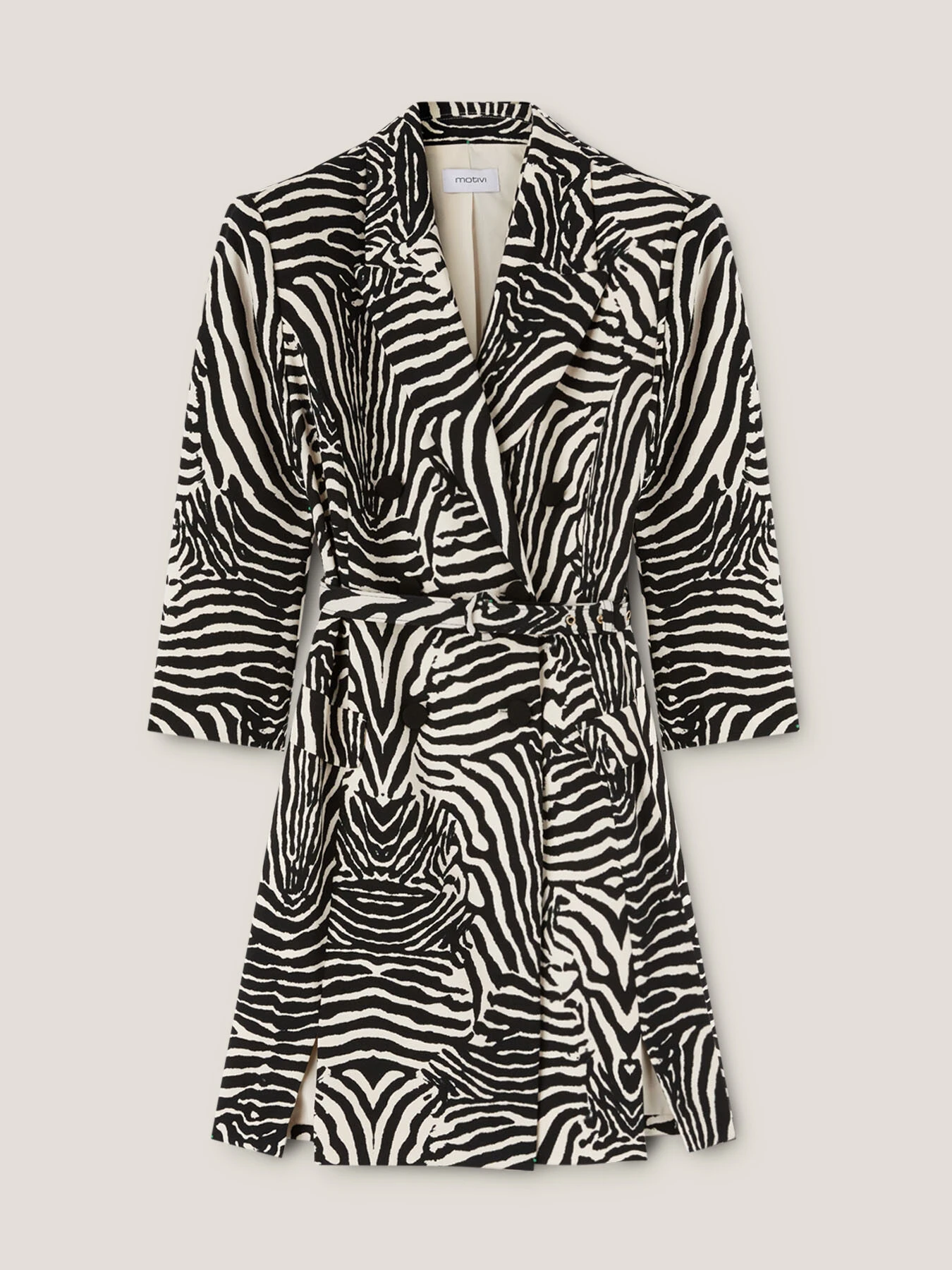 Vestito in tessuto dalla mano crêpe stampa zebrata; modello blazer con chiusura doppiopetto e cintura in vita tono su tono; manica tre quarti.