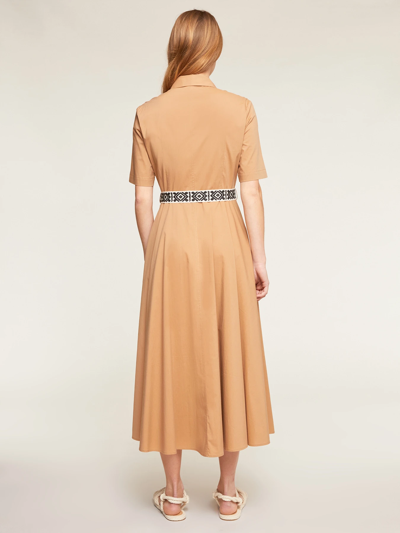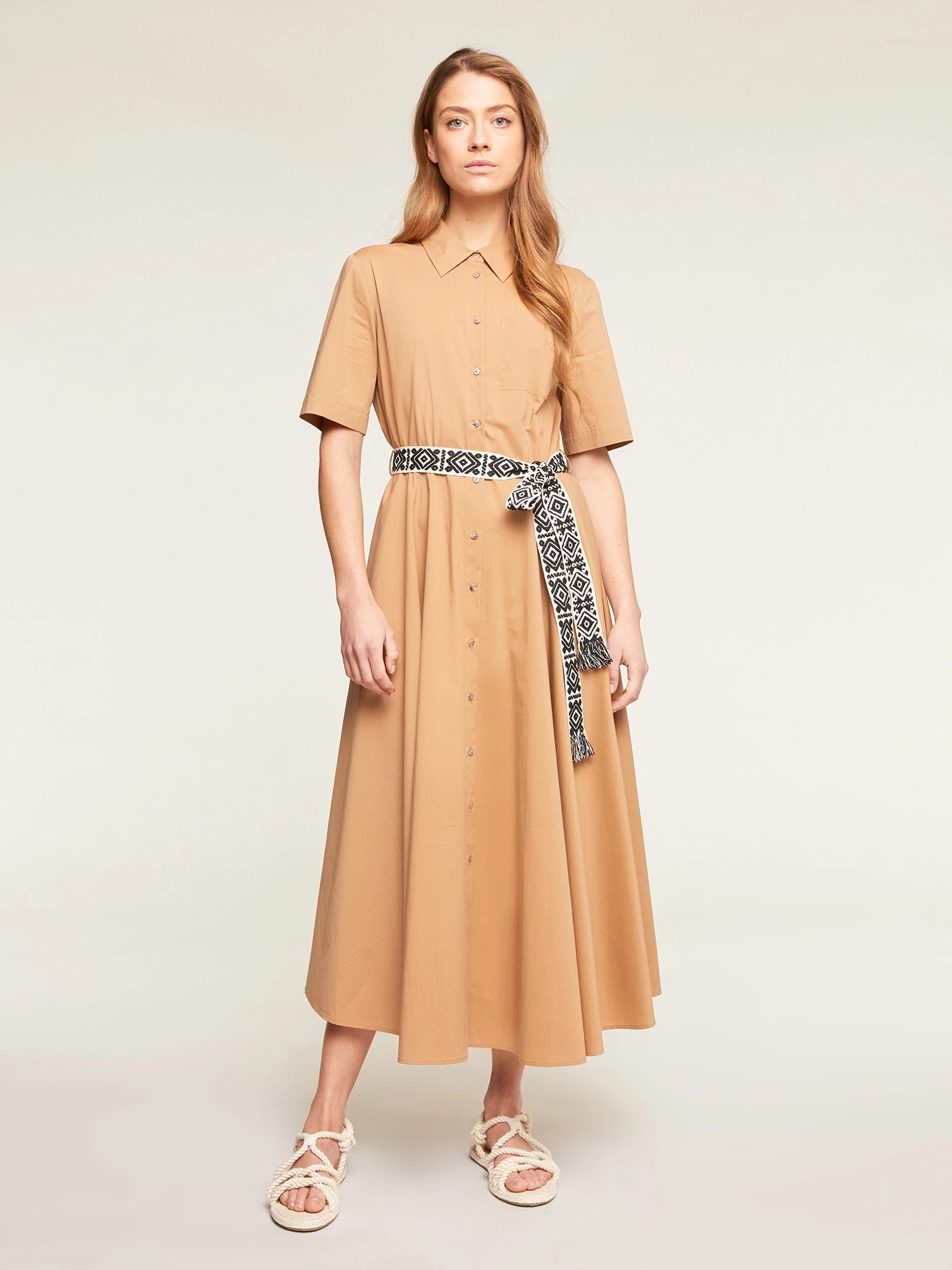Vestito chemisier in popeline misto cotone; chiusura frontale con colletto a vela e bottoni a vista effetto madreperla; cintura in vita in gros grain fantasia etnica, tasche laterali; maniche corte.