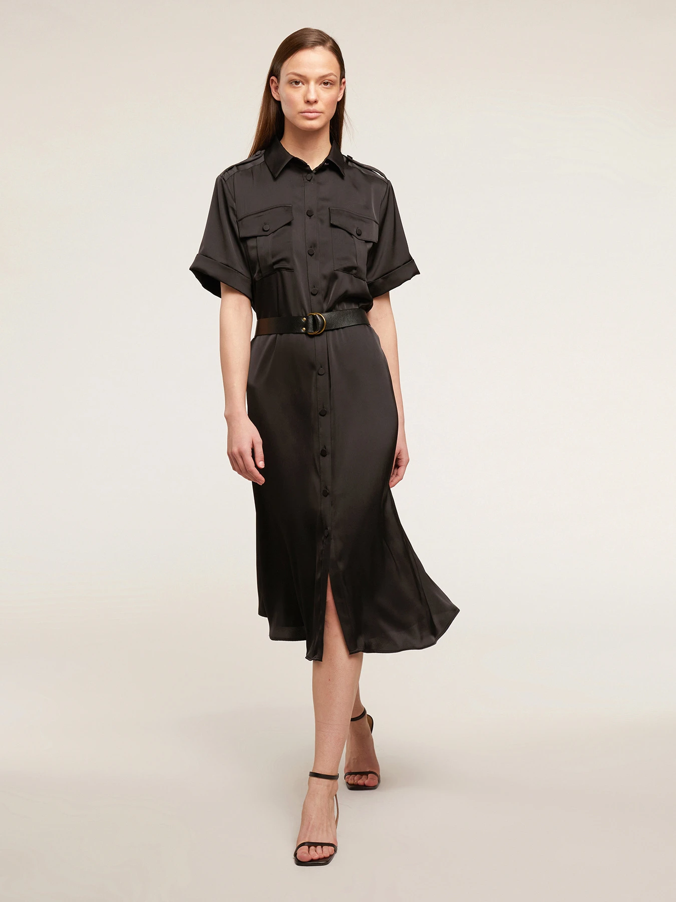 Vestito lungo chemisier in raso satin; chiusura frontale con colletto a vela e bottoni a vista, tasche anteriori applicate; maniche corte con risvolto sul fondo, cintura in vita effetto pelle.