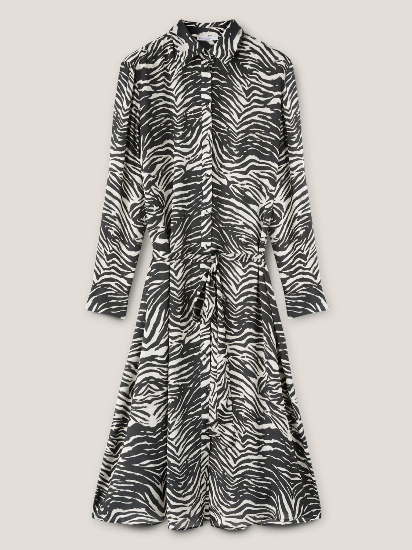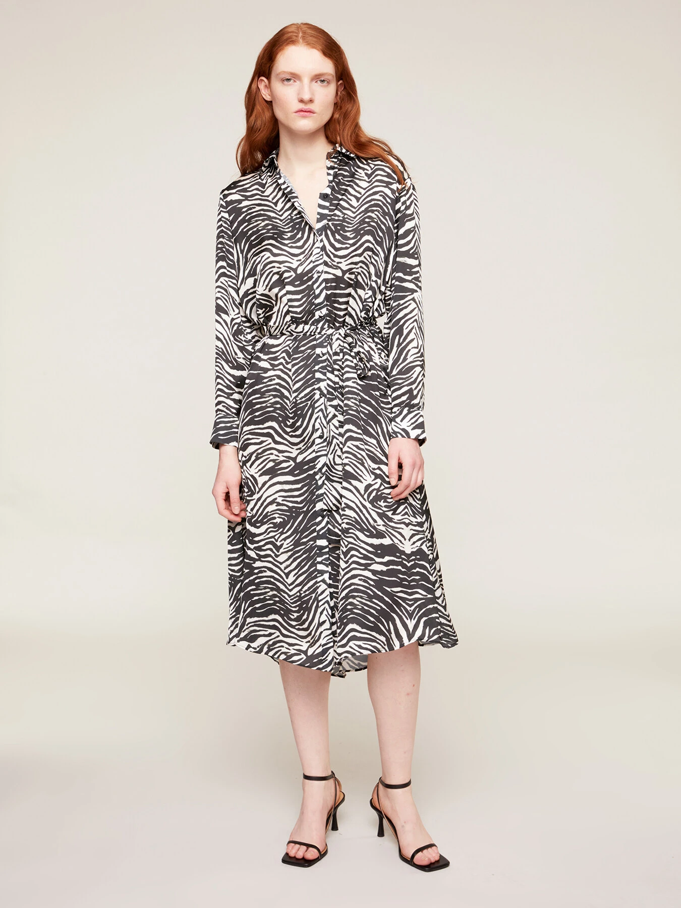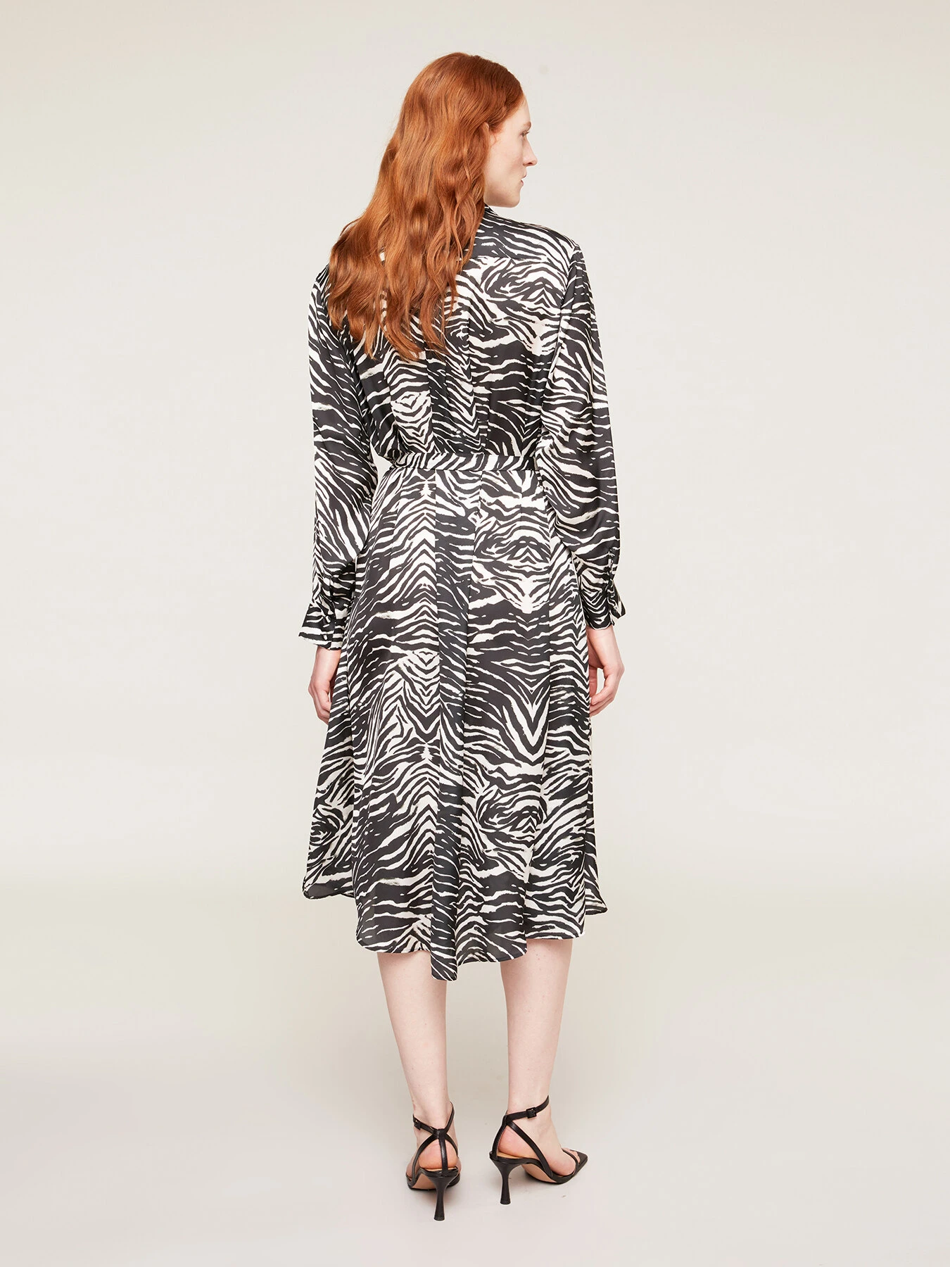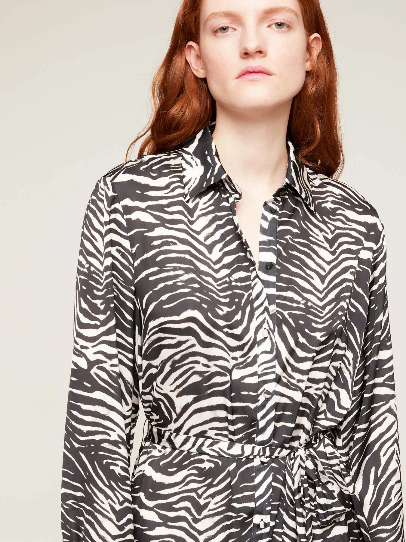 Vestito chemisier in raso fantasia zebrata; lunghezza midi; chiusura frontale con colletto classico e bottoni a vista, maniche lunghe; fusciacca in vita tono su tono.