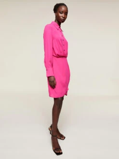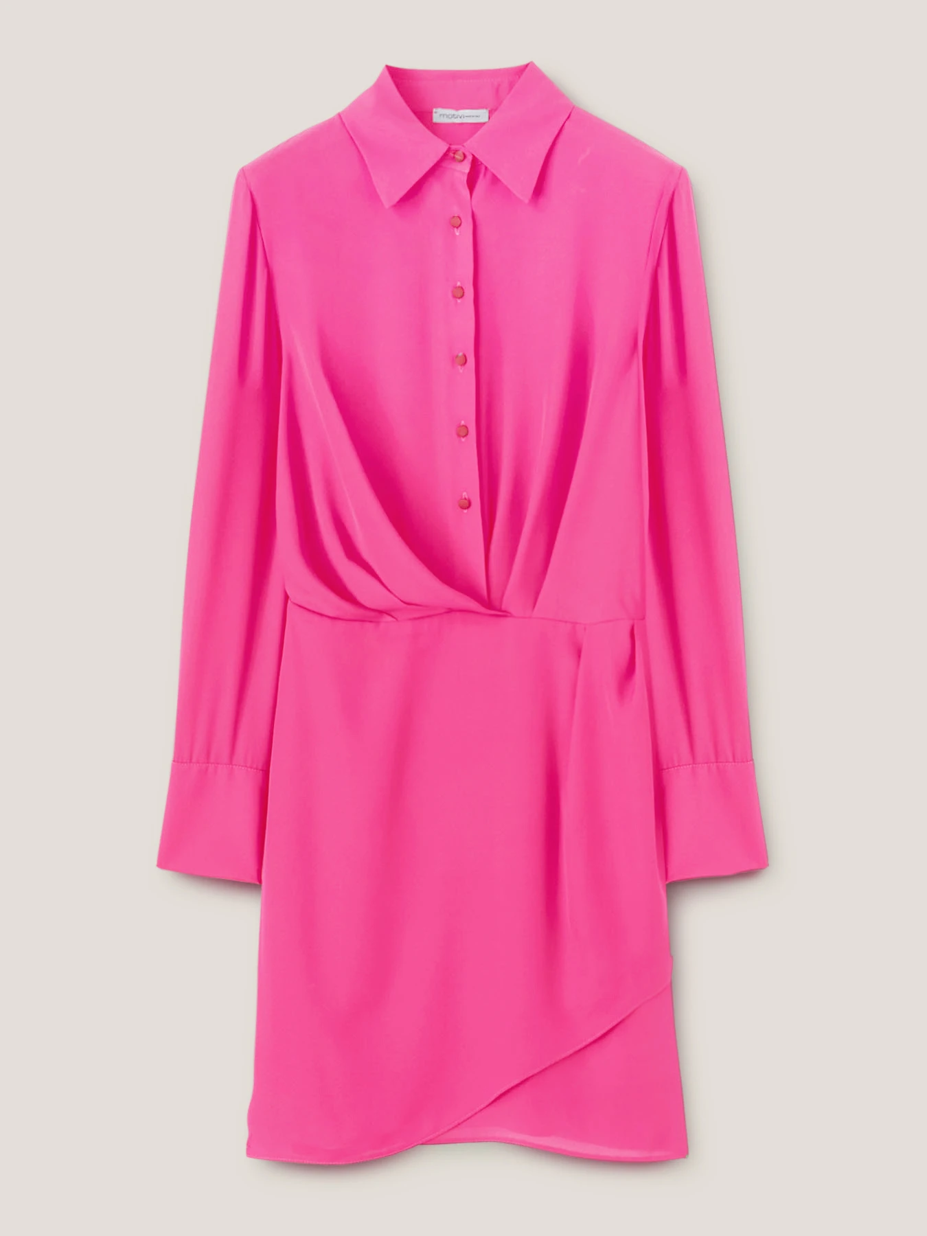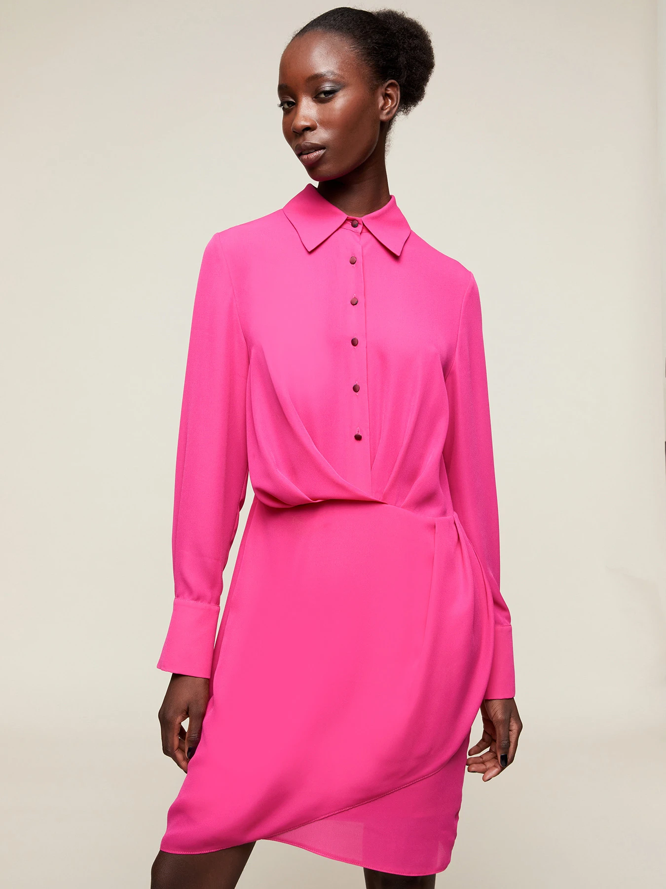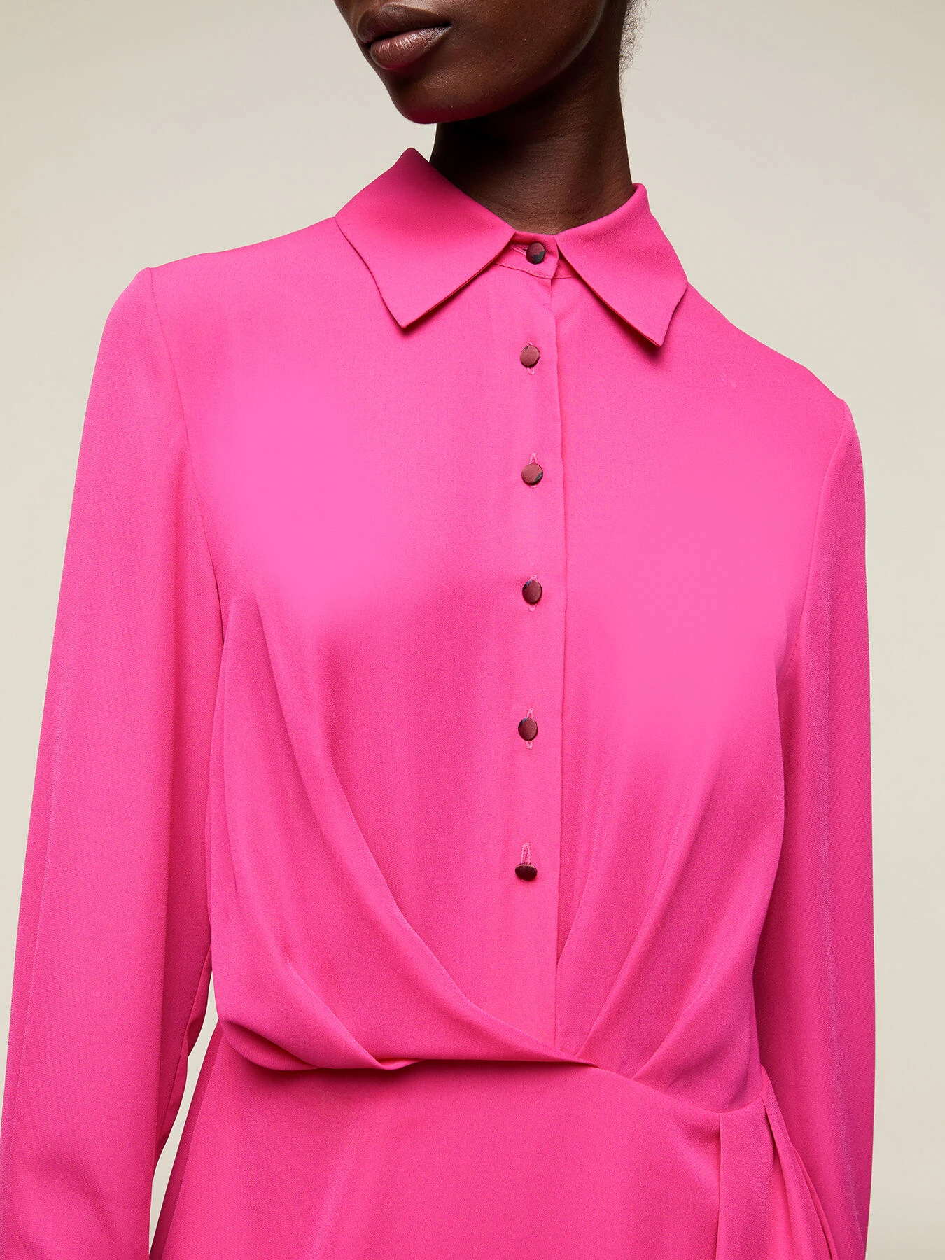 Vestito chemisier in doppia georgette tinta unita; chiusura frontale con colletto classico e bottoni a vista foderati; maniche lunghe con polsino sul fondo, zip invisibile sul fianco; gonna corta effetto portafoglio.