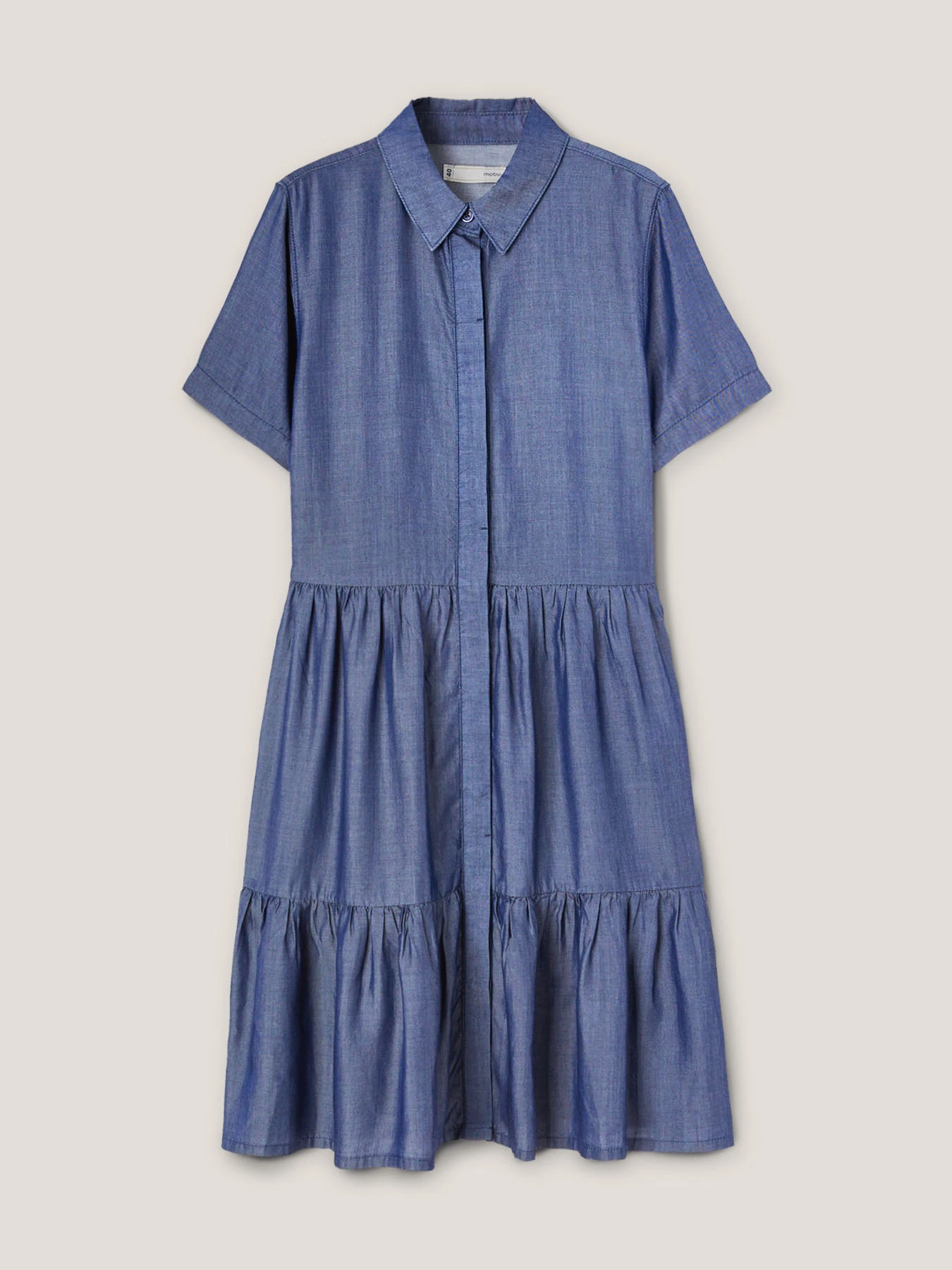Vestito corto in TENCEL™; modello chemisier con colletto a vela e abbottonatura all’inglese; maniche corte, gonna svasata con balze.; Le fibre di lyocell e modal a marchio TENCEL™ sono prodotte mediante processi ecologicamente responsabili dal legno, materia prima naturale proveniente da fonti sostenibili.