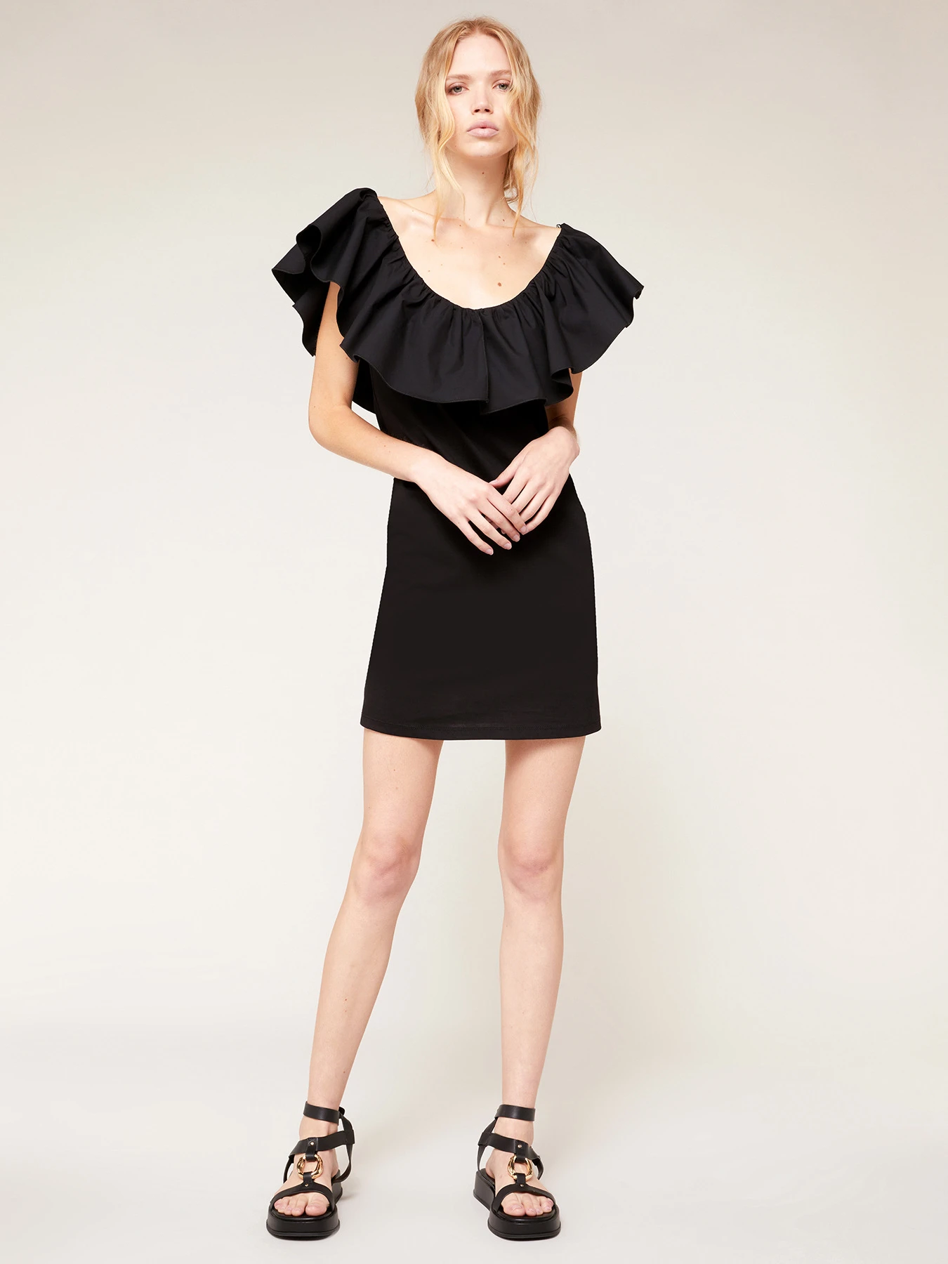 Vestito corto in jersey di cotone tinta unita; scollo off-shoulders con elastico interno e maxi volant; linea diritta.