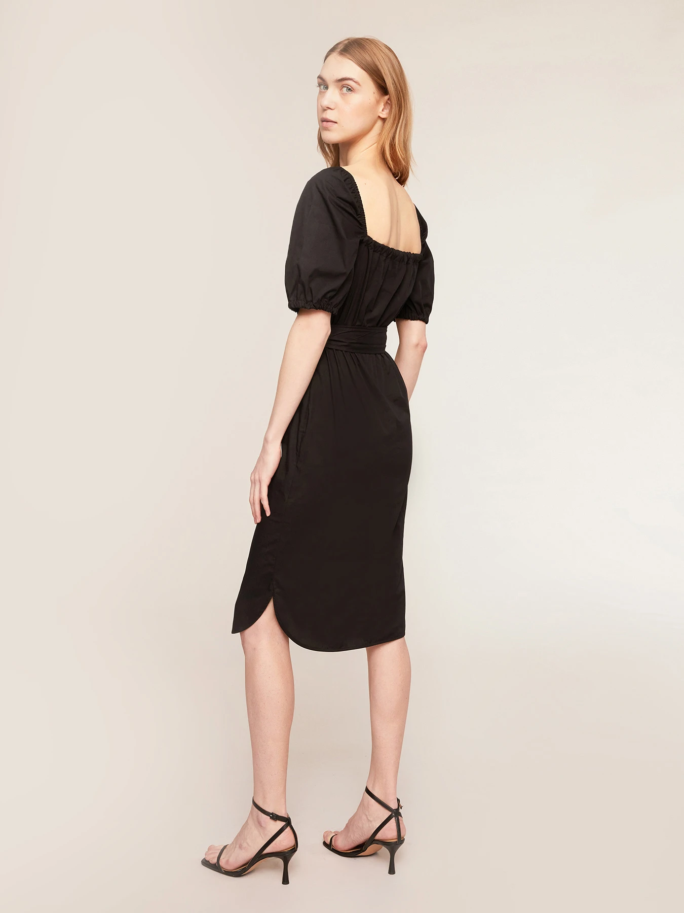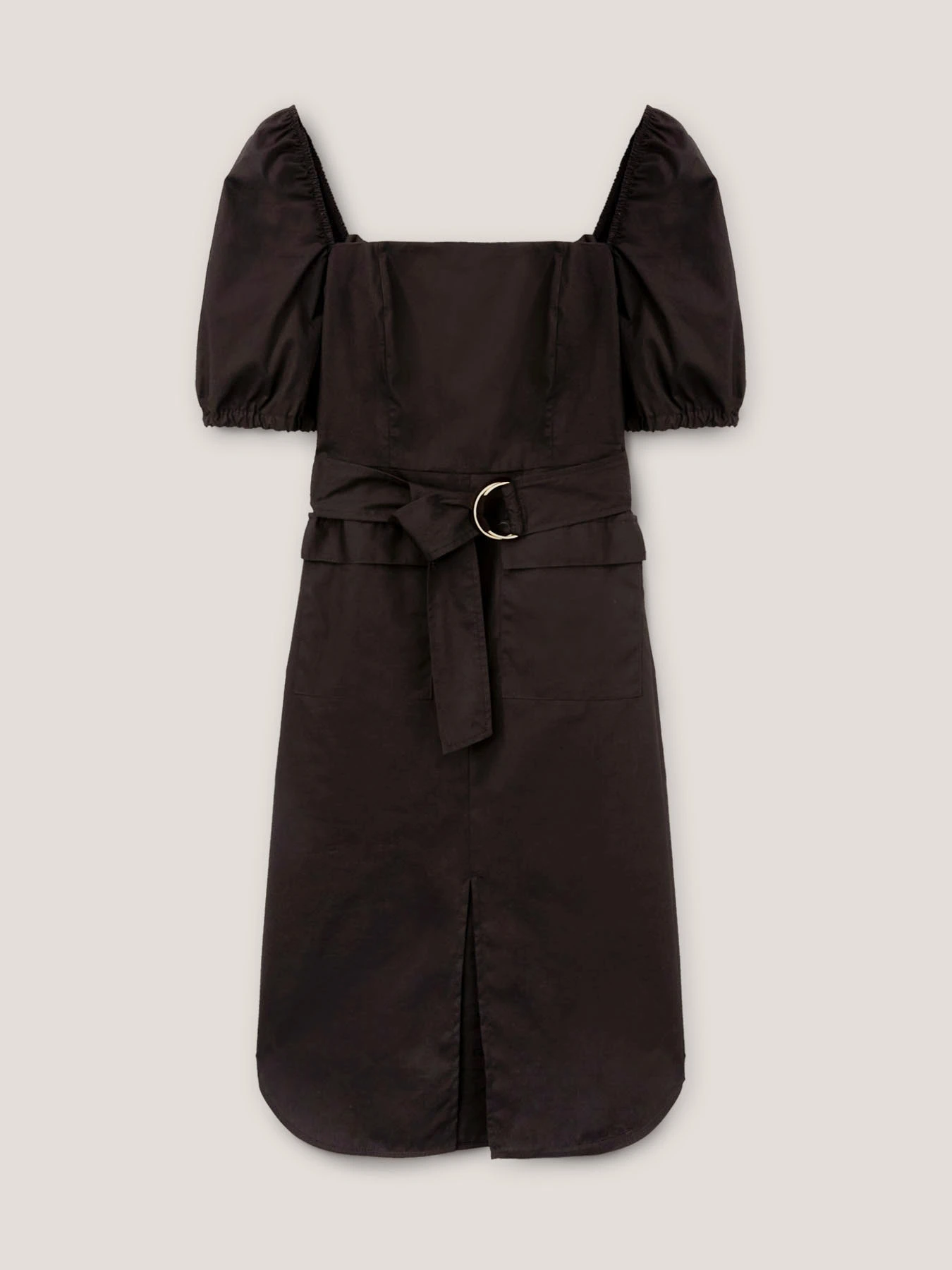 Vestito estivo in popeline di cotone tinta unita; scollo quadrato, maniche corte a sbuffo con motivo elastico al fondo; cintura in vita tono su tono con fibbia metallica, apertura laterale con zip; tasche frontali applicate, fondo con spacco centrale e bordi arrotondati.