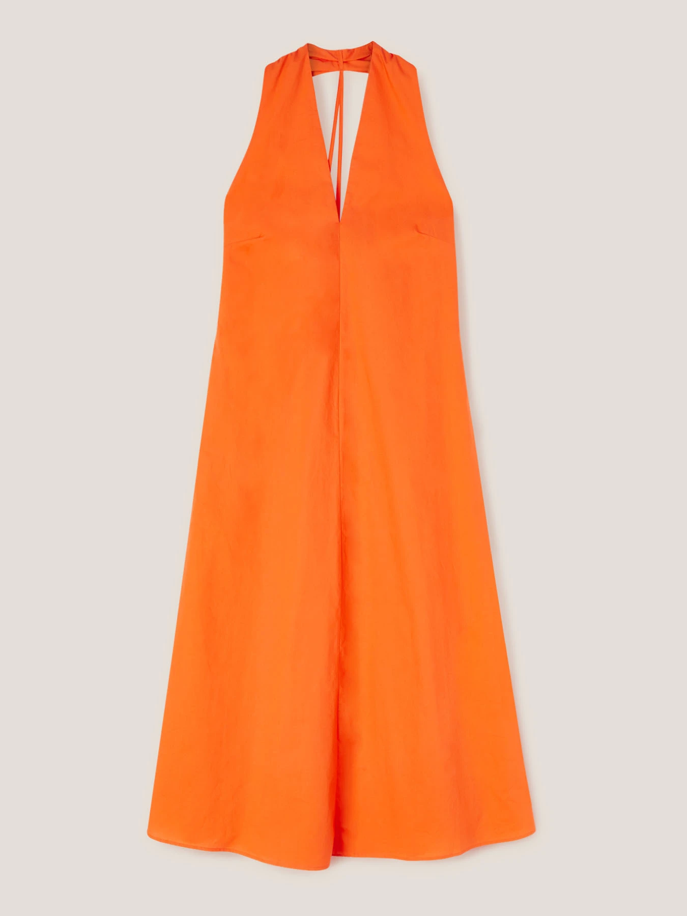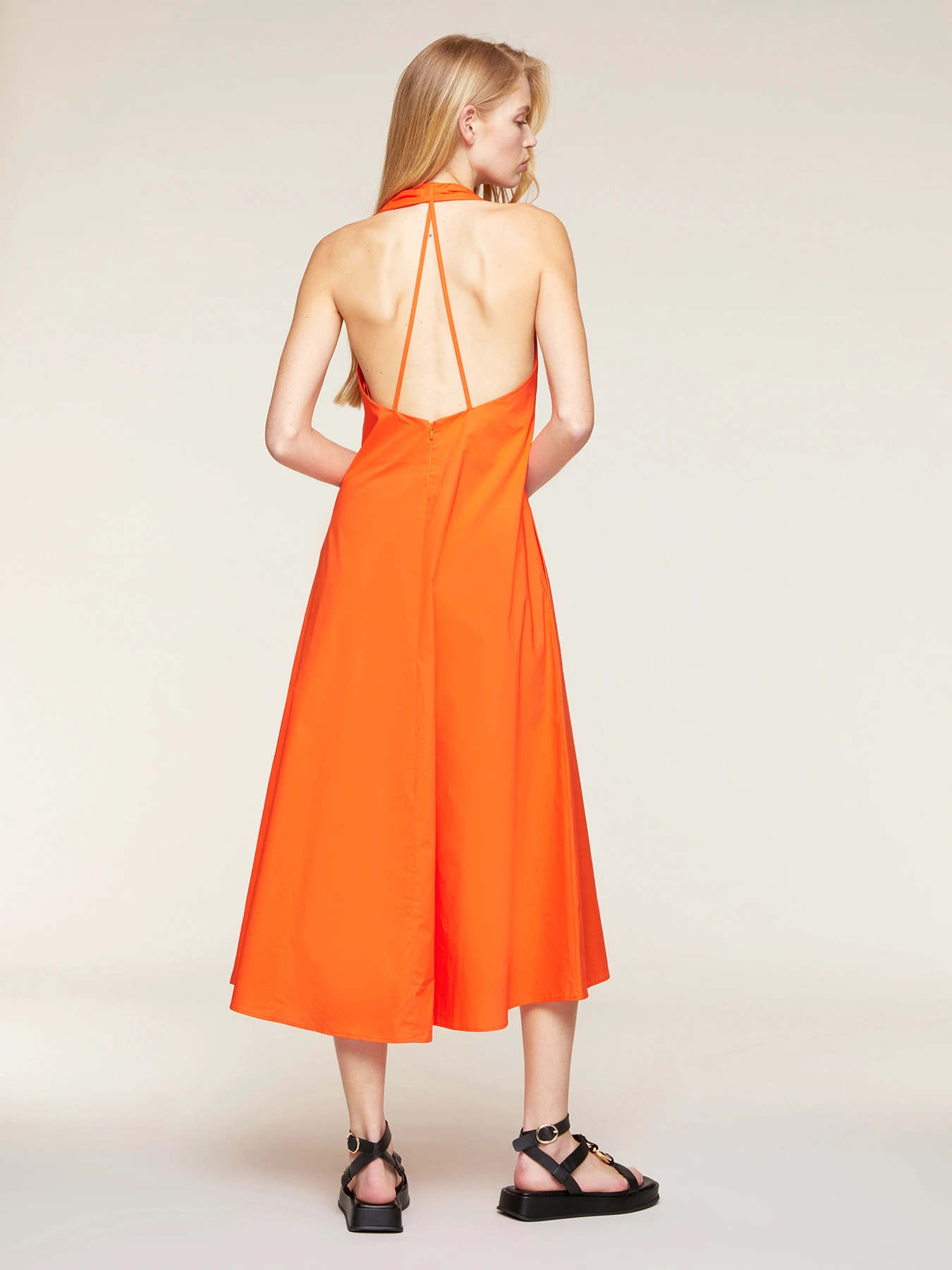 Vestito estivo lungo in popeline di cotone tinta unita; linea svasata con scollo halter e schiena scoperta; chiusura con zip nel centro dietro, tasche verticali inserite nel fianco.