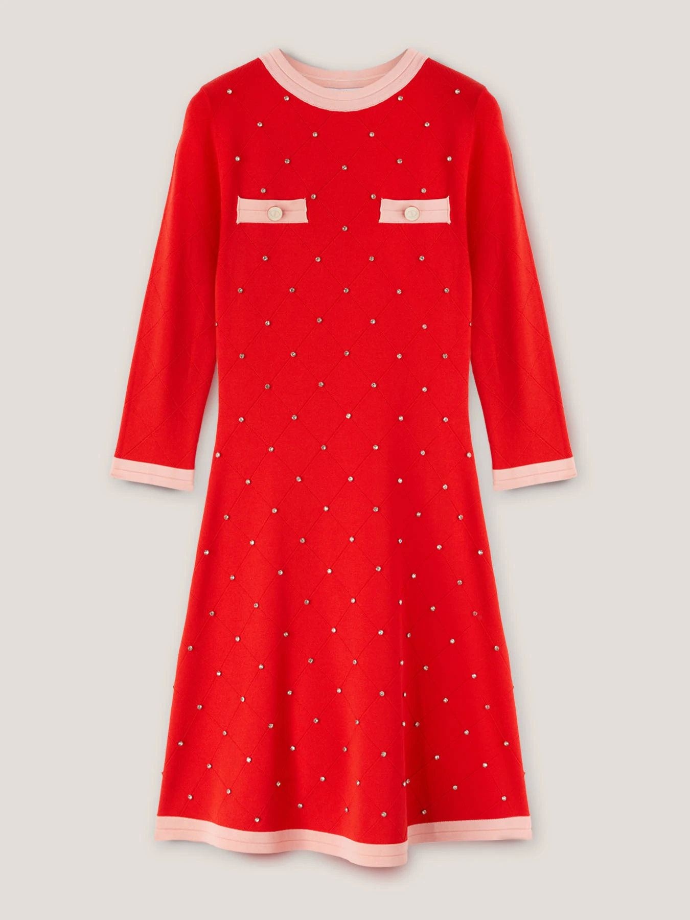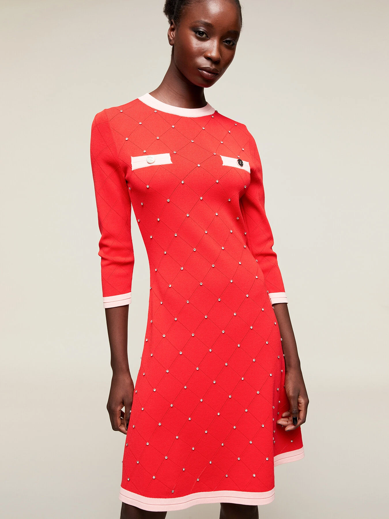 Vestito corto in maglia viscosa comfort con disegno a rombi; scollo frontale tondo con bordo a contrasto; motivo tasche a maxi filetto con bottone; maniche lunghezza tre quarti, ricamo frontale di pietre crystal.