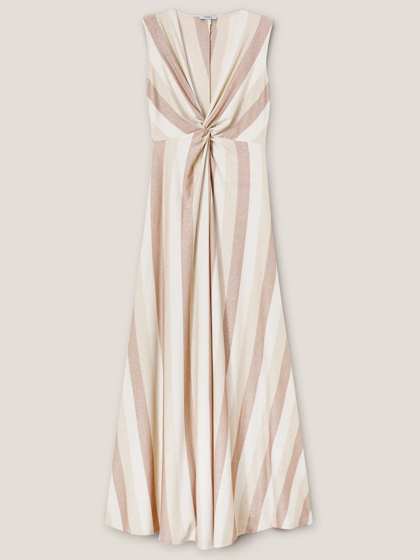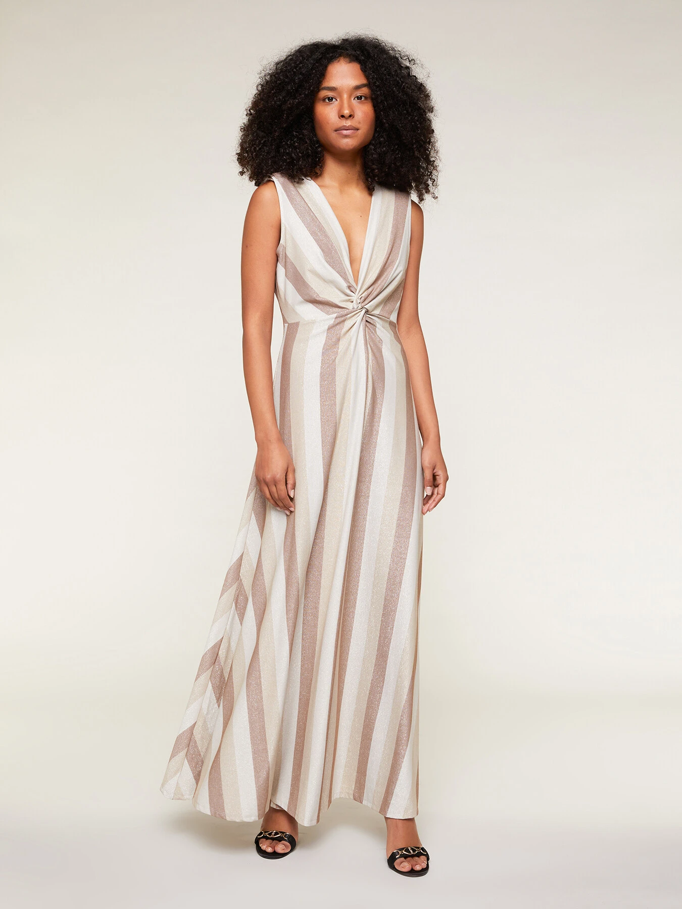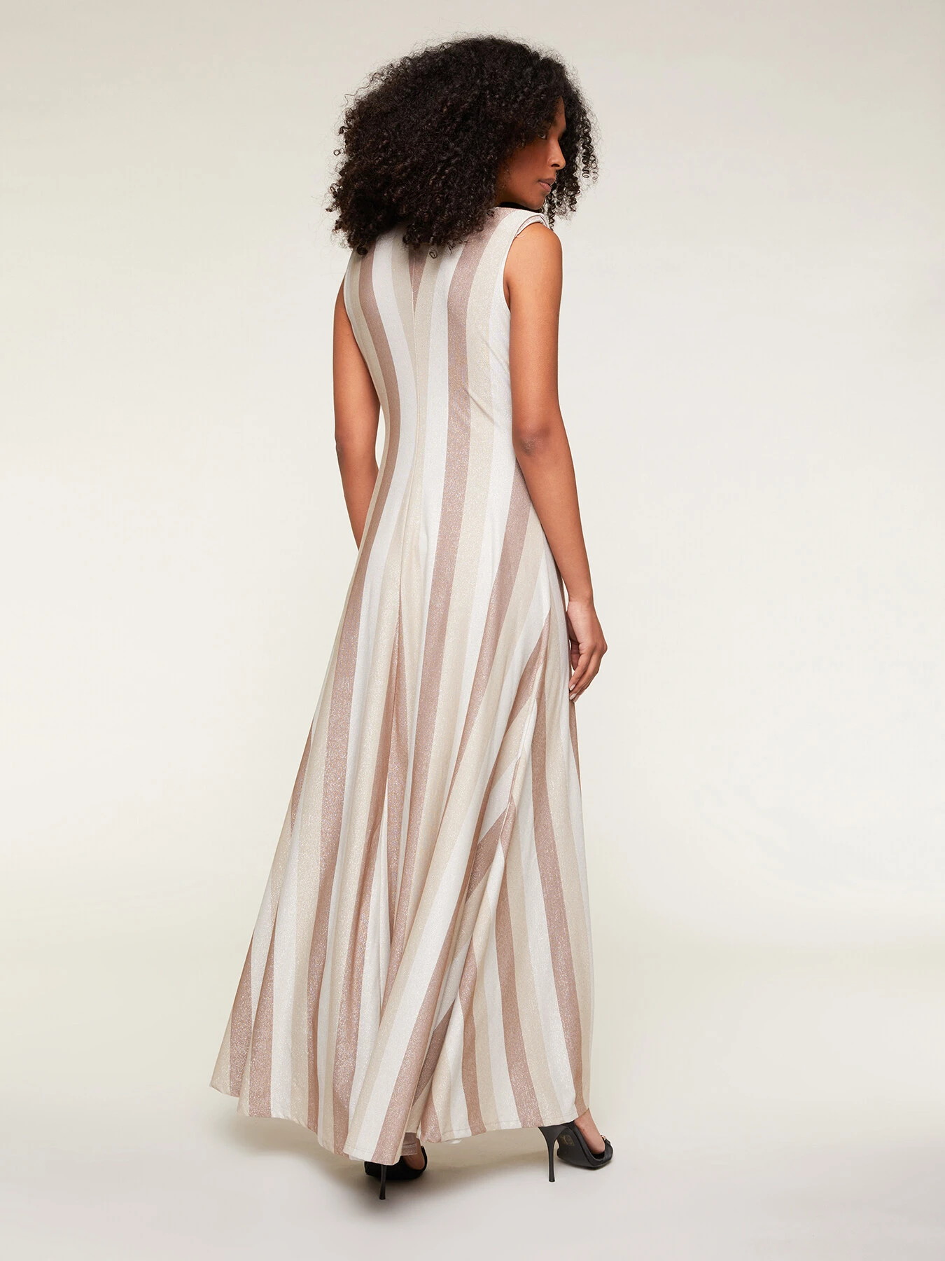 Vestito in jersey lurex fantasia a righe; scollo frontale profondo con motivo torchon; modello senza maniche a spalla larga; gonna lunga svasata sul fondo.