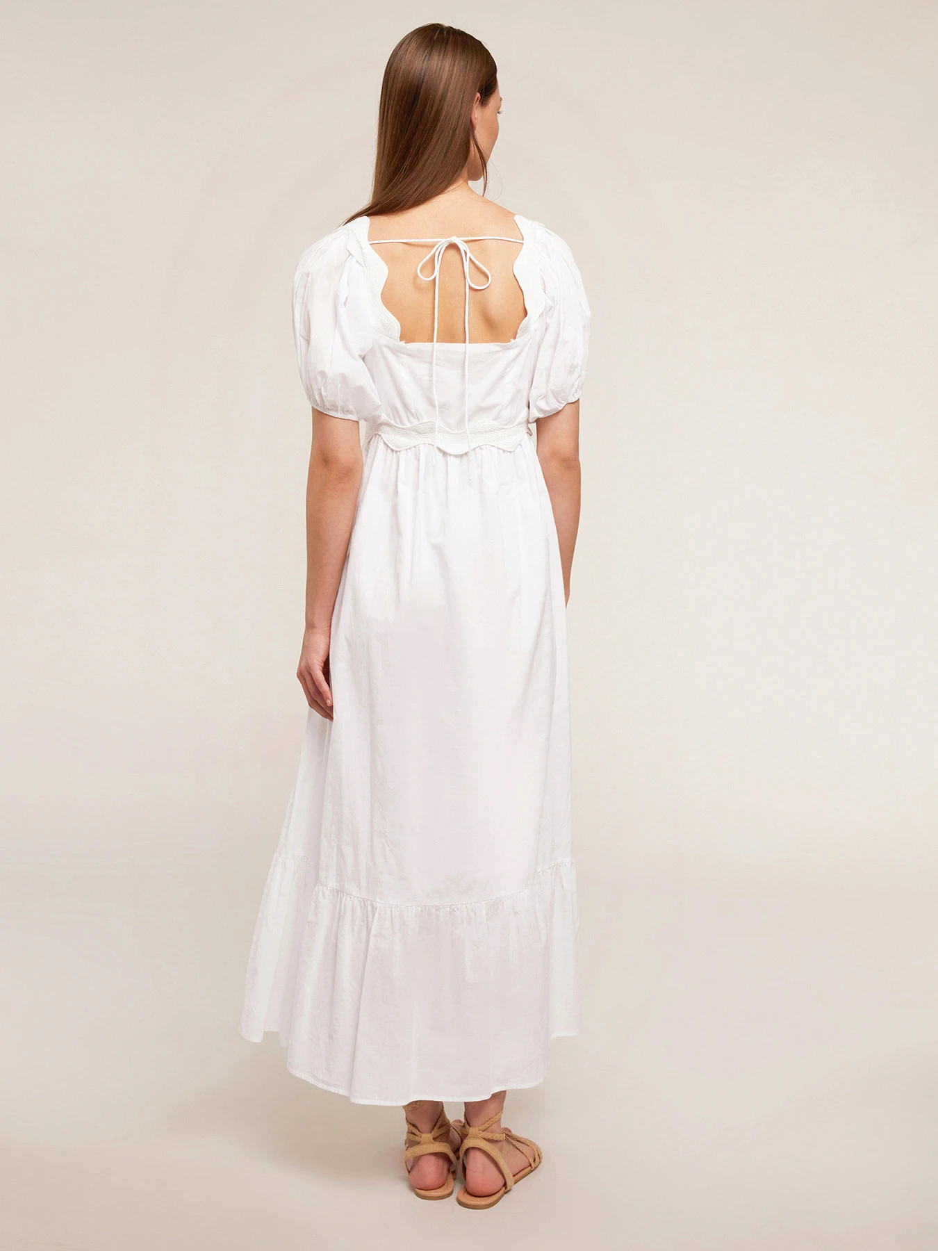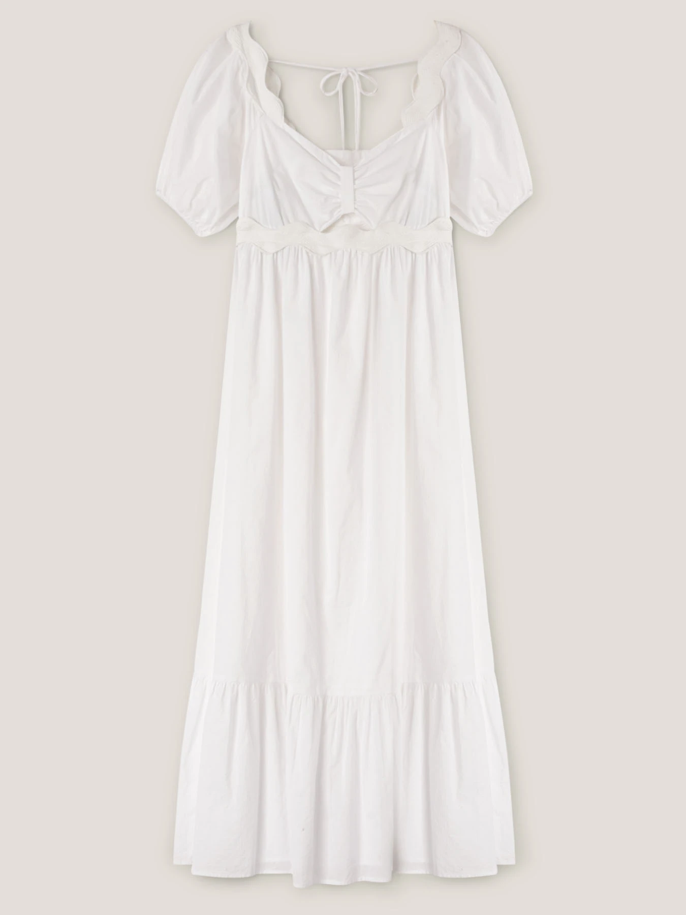 Vestito in popeline di cotone tinta unita; profondo scollo frontale a cuore con nastro ricamato in cotone e motivo cut-out; ampie maniche corte a palloncino; gonna lunga svasata con balza al fondo, chiusura con zip laterale.
