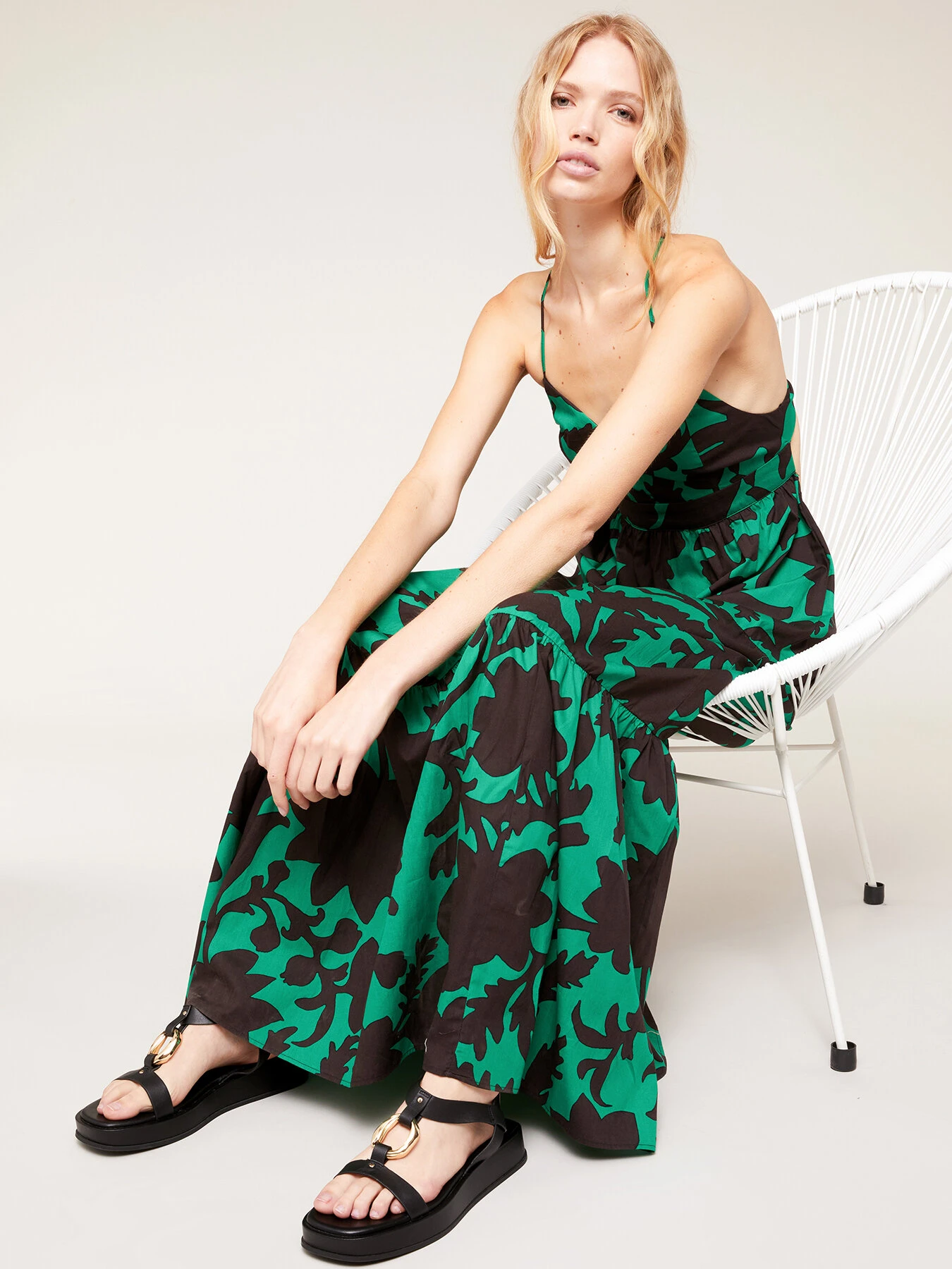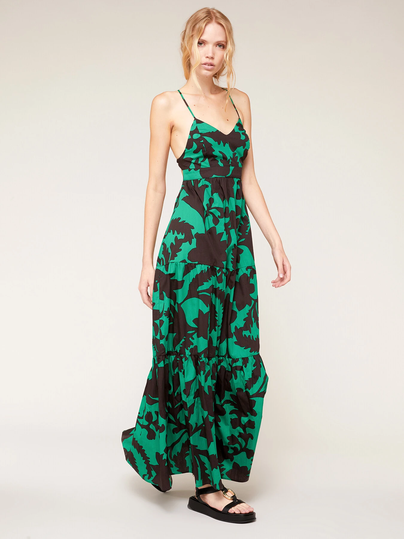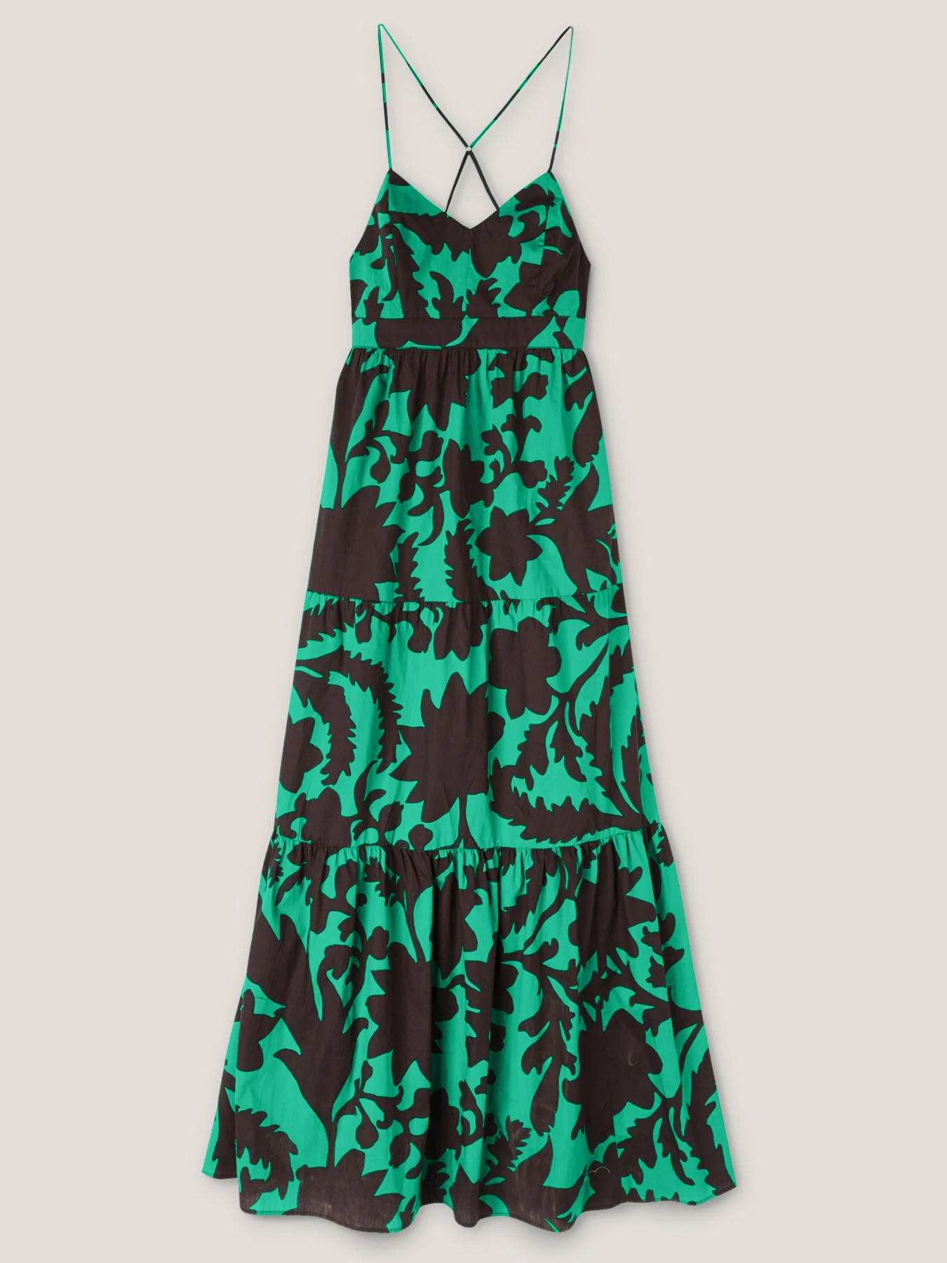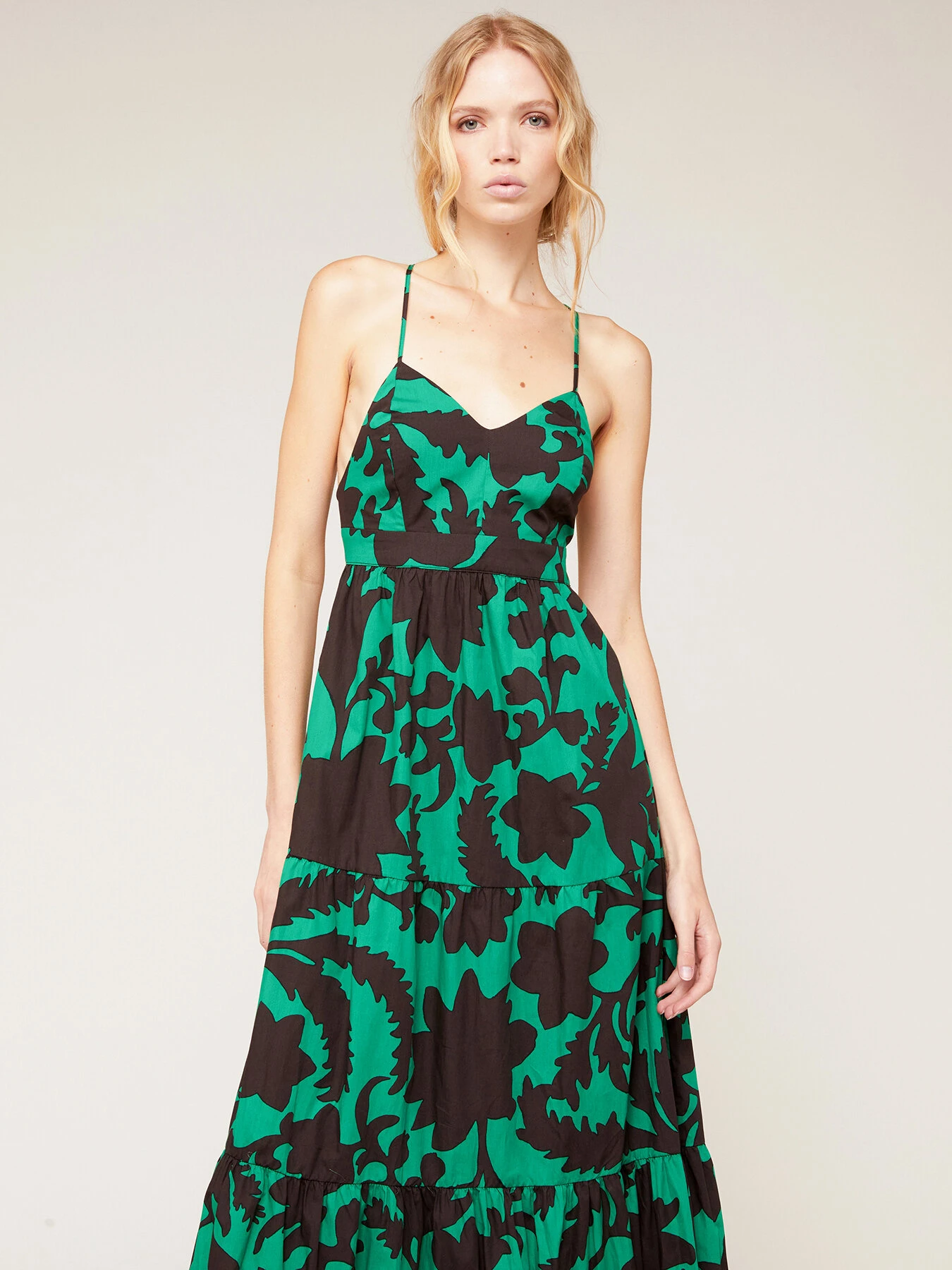 Vestito lungo estivo in popeline di cotone fantasia floreale; corpino con coppe sagomate a triangolo e spalline fini con motivo ad incrocio, schiena con ampia scollatura; gonna svasata con balze sul fondo.