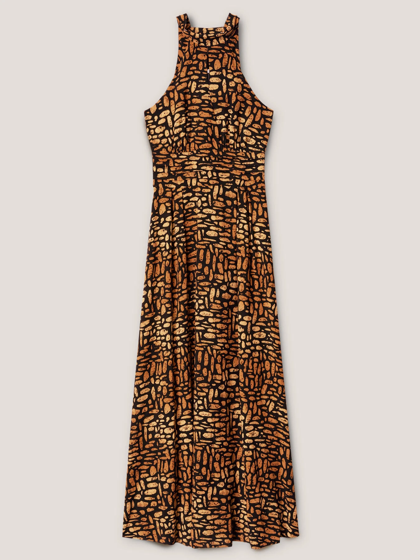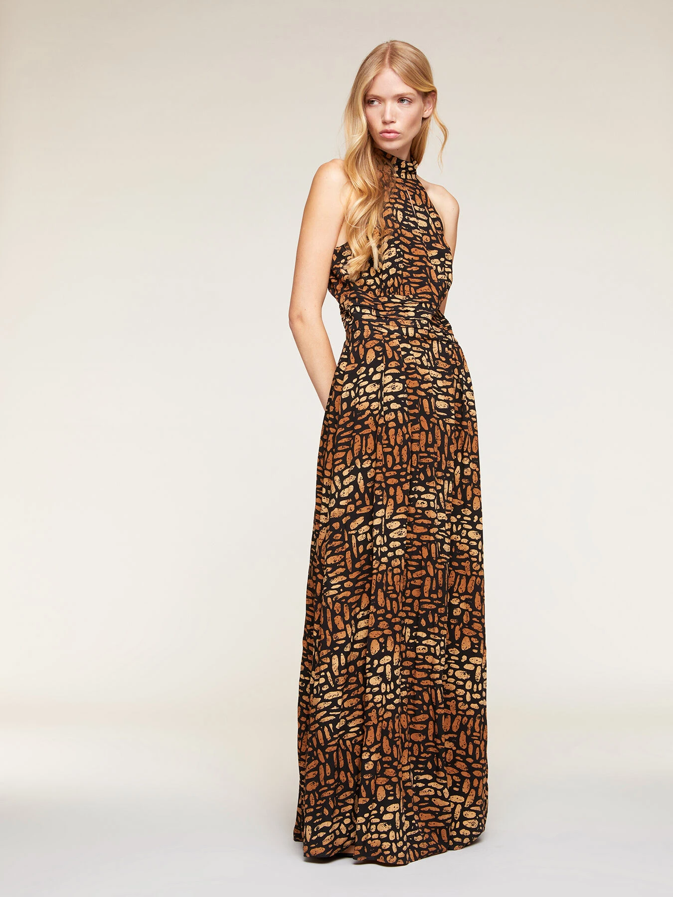 Vestito in tessuto 100% viscosa fantasia etnica; scollo all’americana con incrocio frontale e nastri da annodare al collo; fascia in vita con motivo pieghe; gonna lunga svasata, chiusura nel centro dietro con zip.