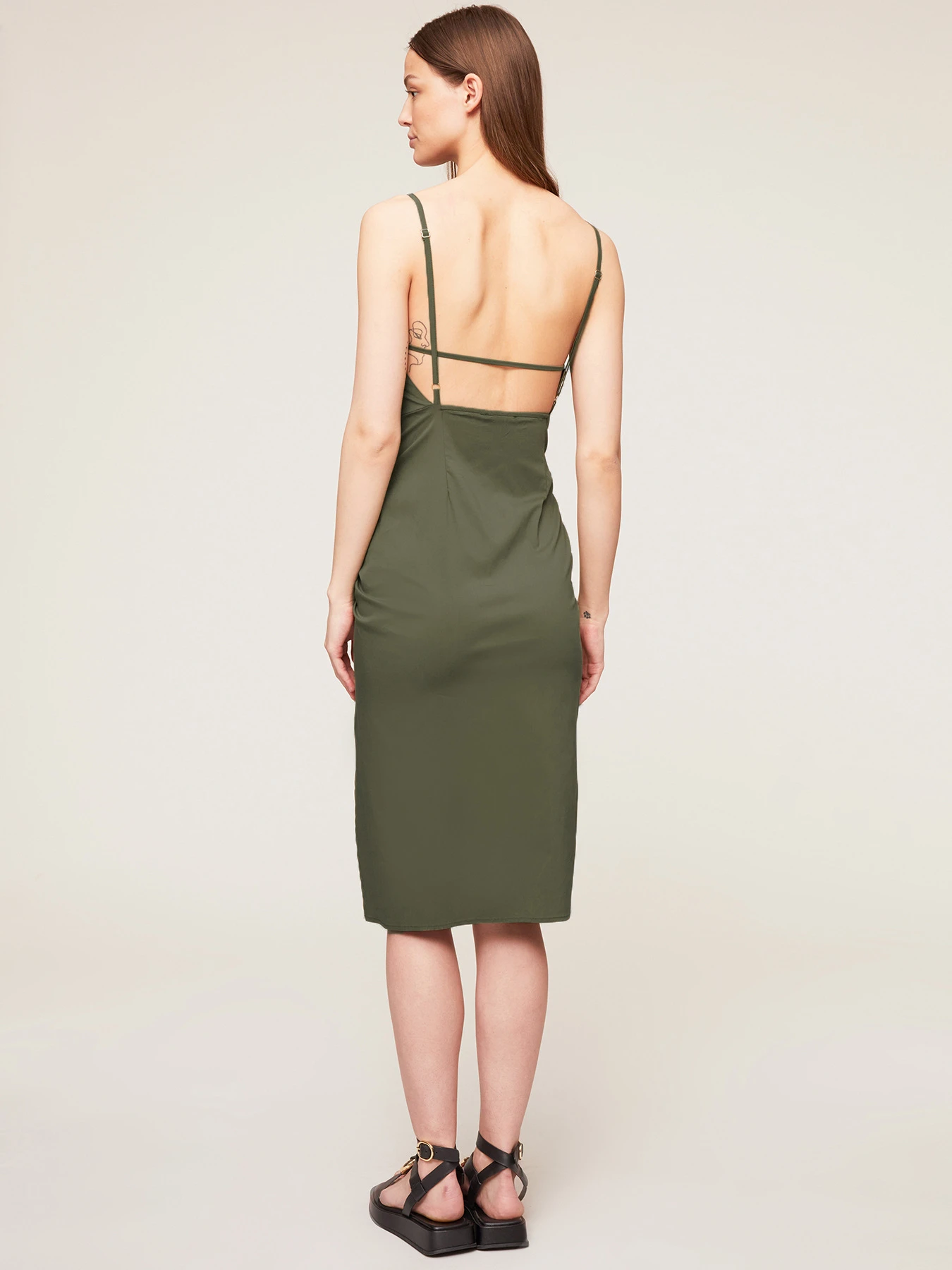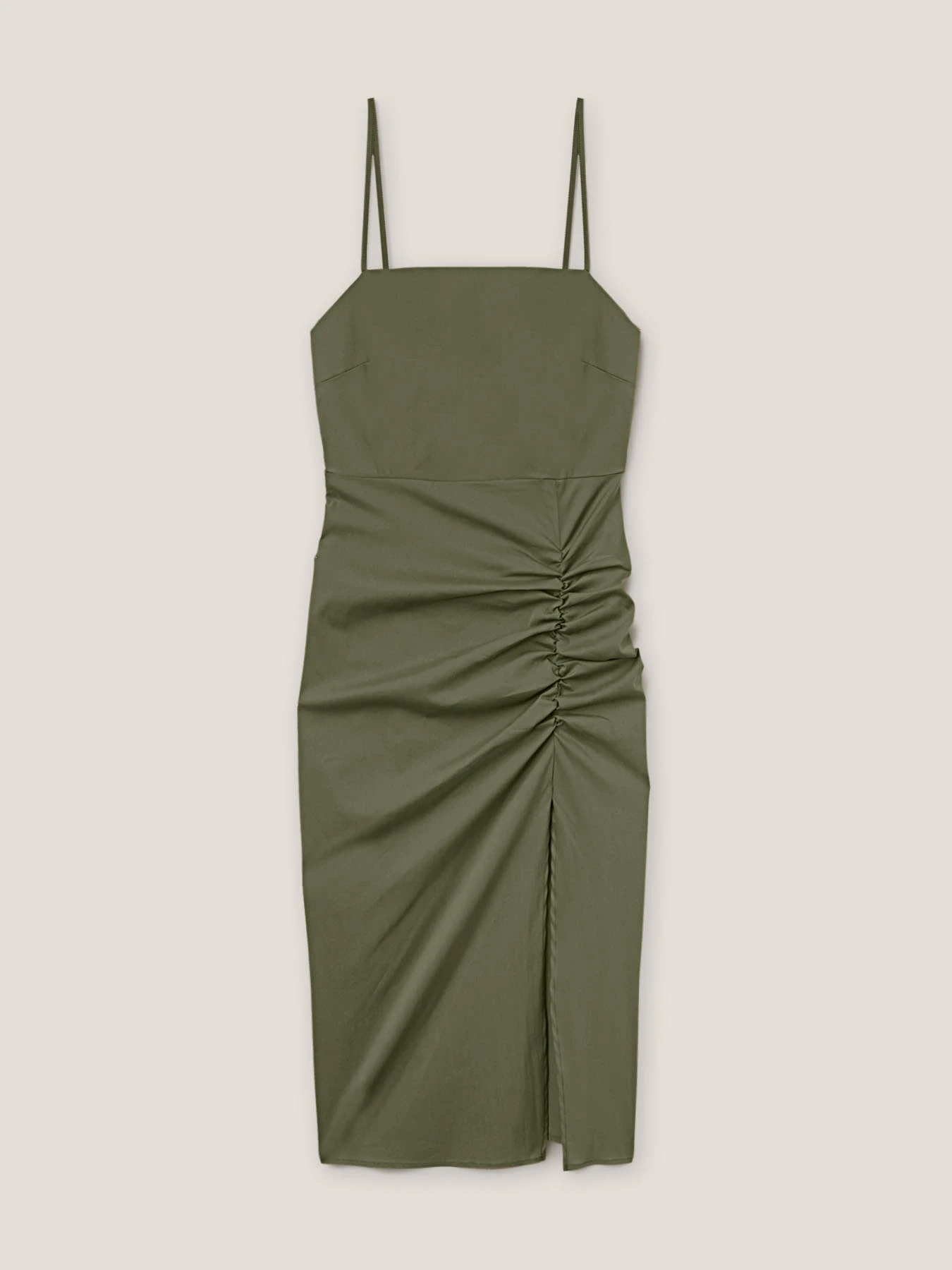 Vestito midi estivo in popeline misto cotone; scollo quadrato e spalline fini regolabili; apertura laterale con zip invisibile, spacco laterale con arriccio.