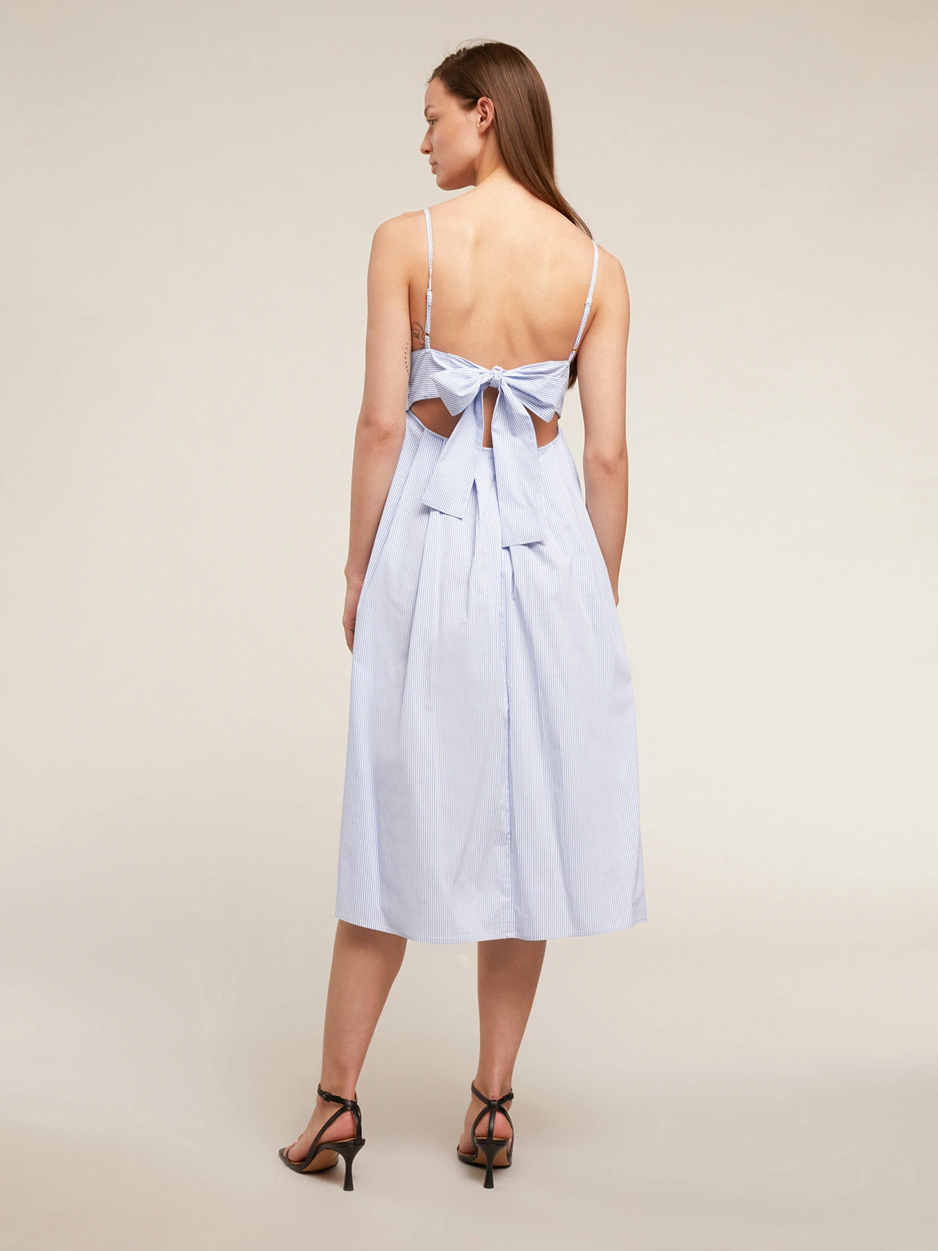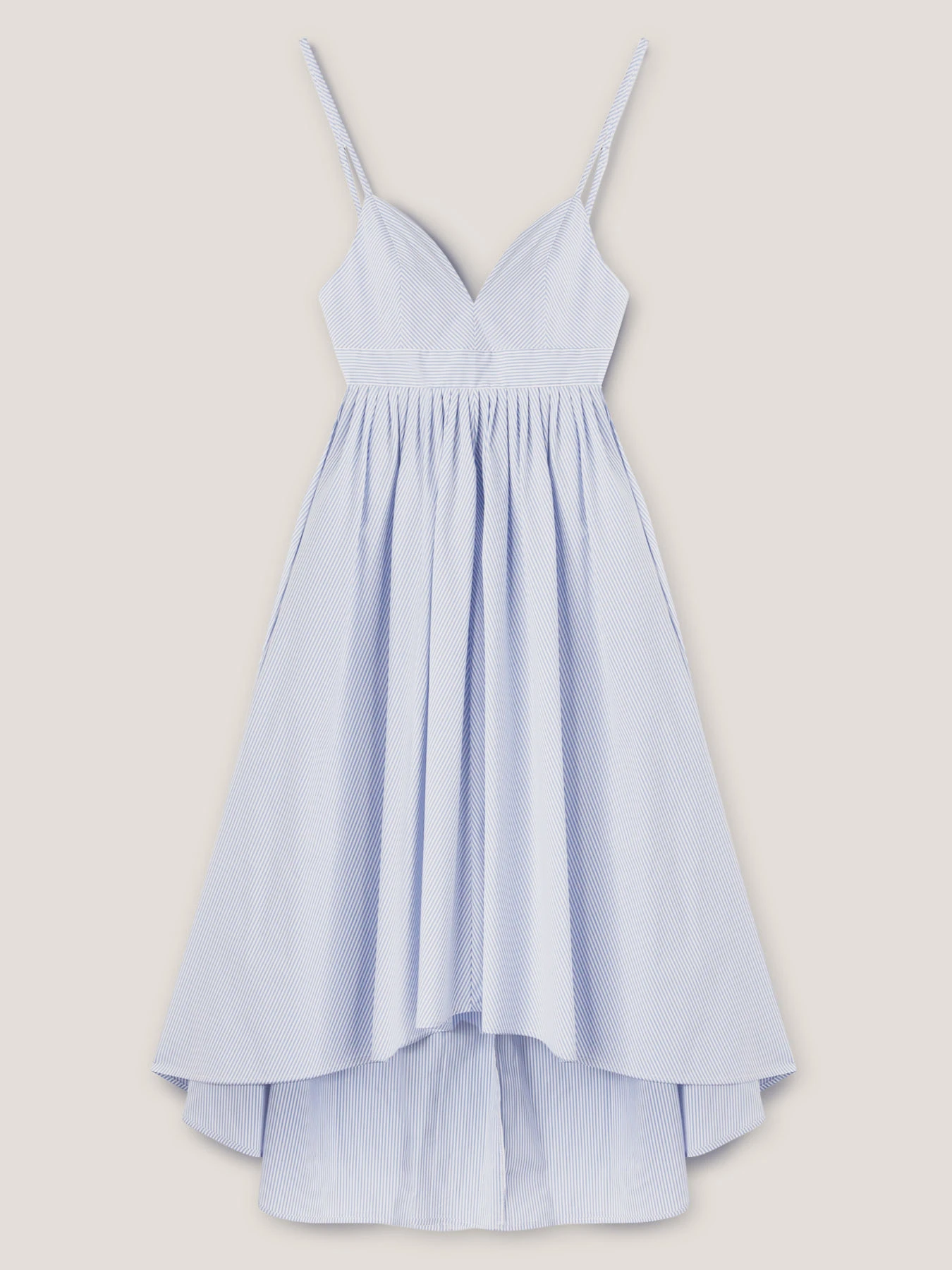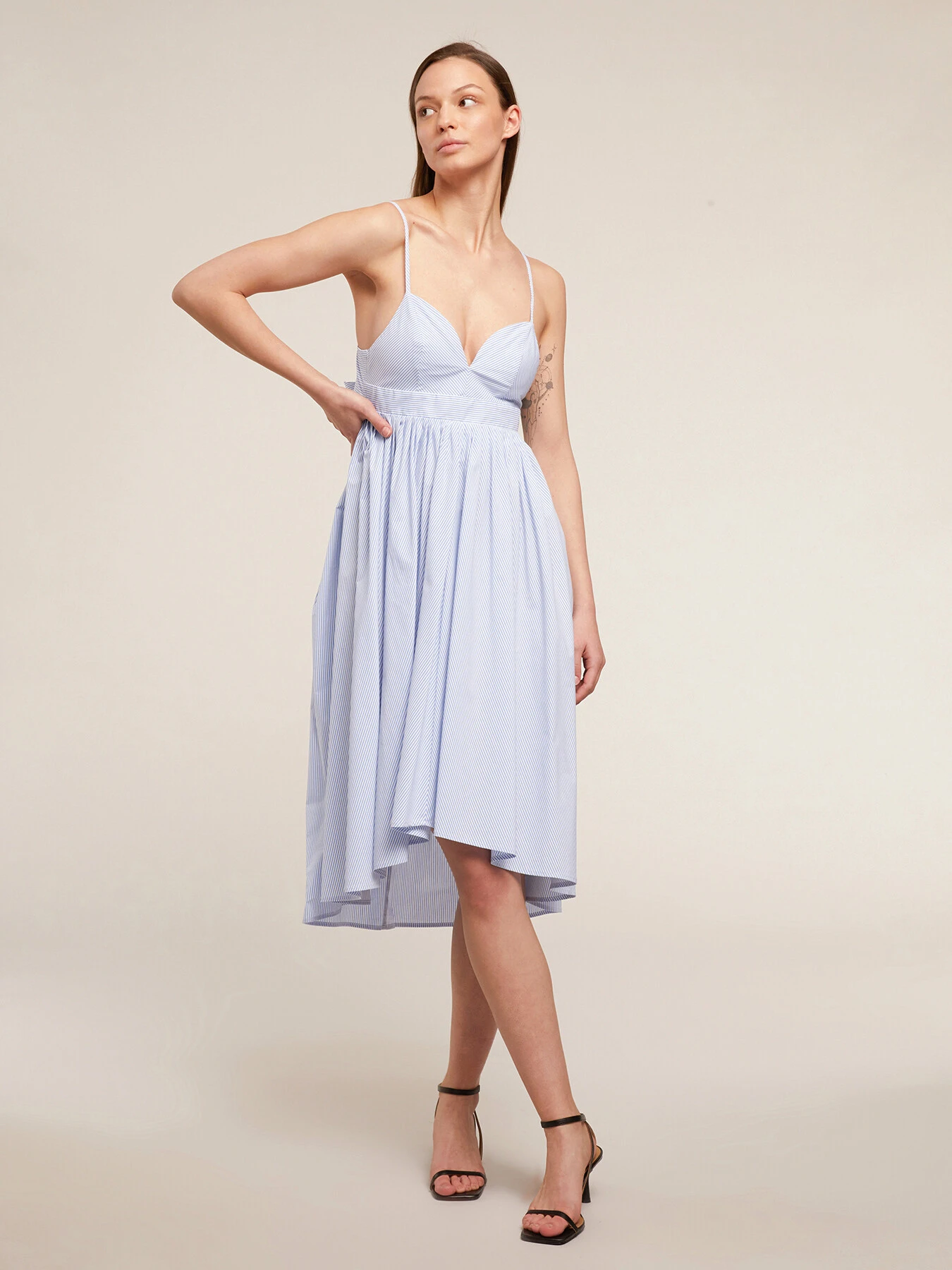 Vestito midi estivo in popeline di cotone a righe; scollo a cuore con spalline fini regolabili e lacci da annodare sul retro; gonna a ruota con fondo asimmetrico, chiusura nel centro dietro con zip.