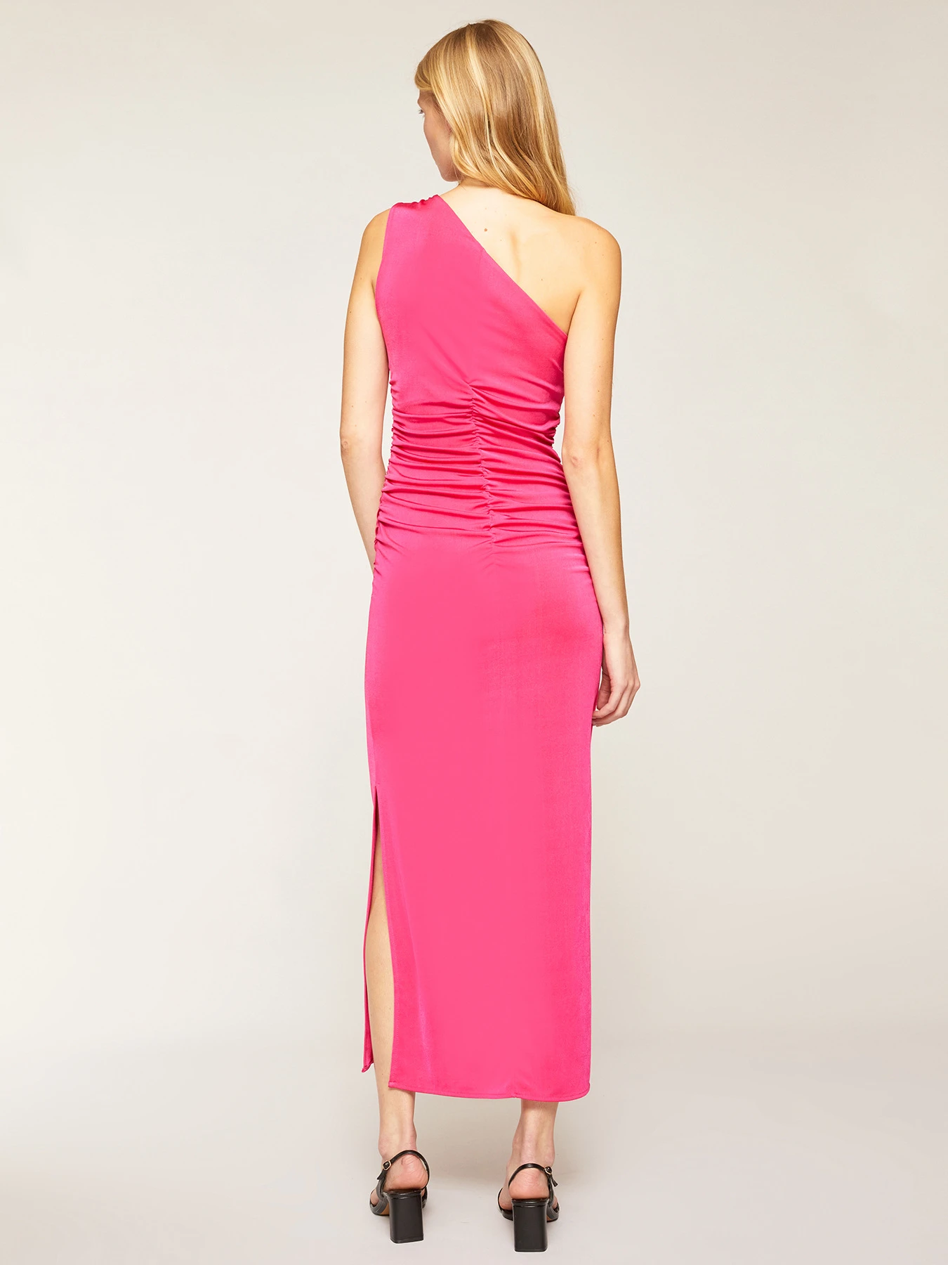 Vestito estivo in jersey tecnico tinta unita; modello monospalla senza maniche; gonna lunga con motivo a drappeggio e arricci, vestibilità slim.