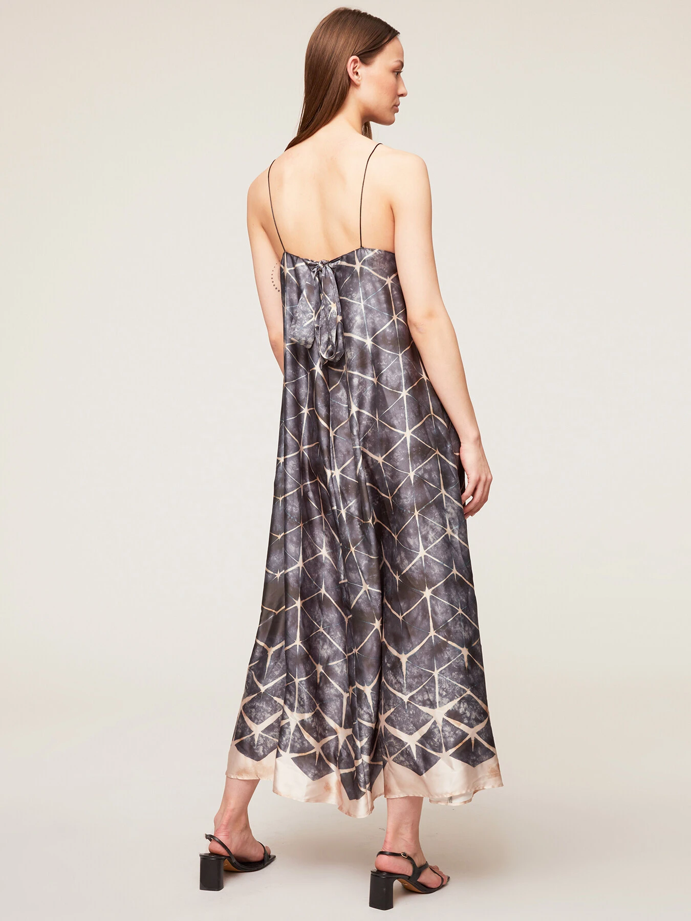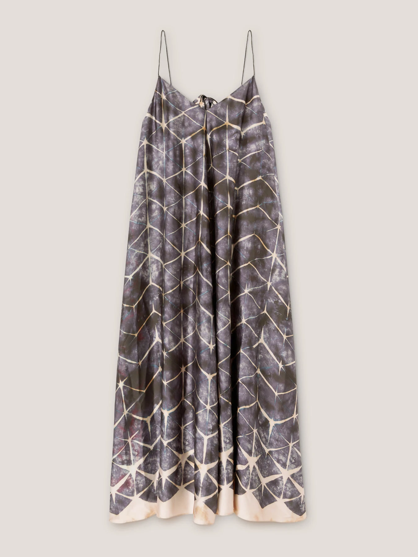 Vestito over in raso fantasia astratta; scollo a v frontale con nastri da annodare sulla schiena; spalline fini in corda, fondo ampio svasato.