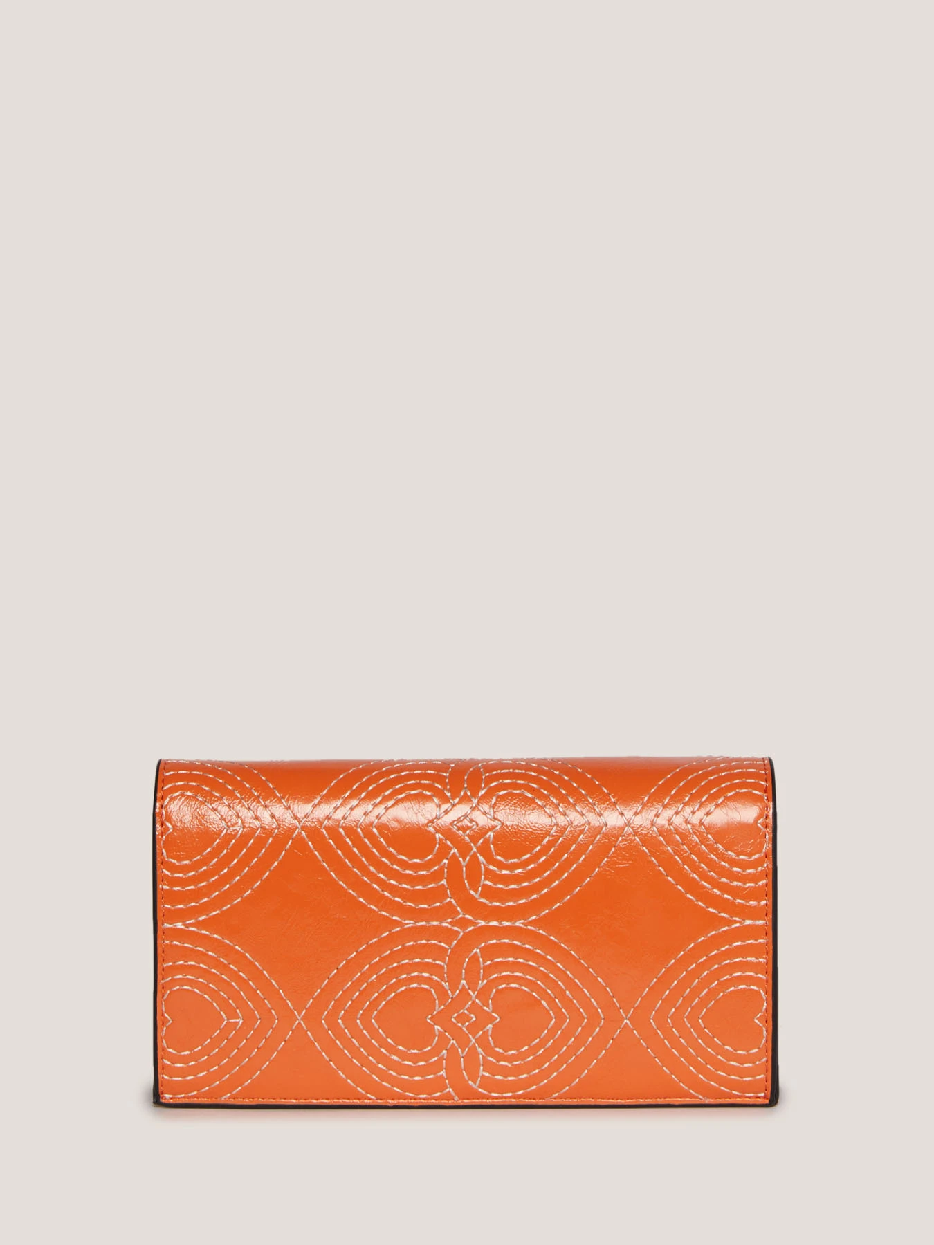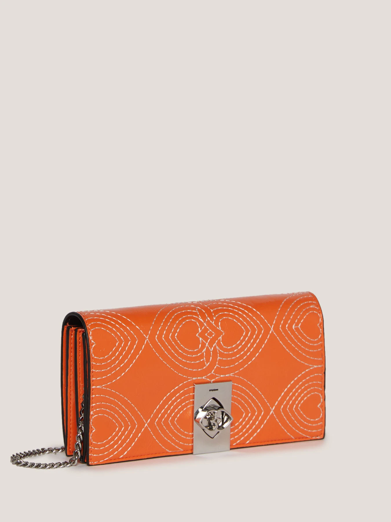 Wallet Bag in similpelle con ricamo Double Love; chiusura con nottolino Double Love, tracolla in catena metallica, tasche interne; dimensioni: altezza 10 cm, larghezza 19 cm, ampiezza 4 cm.