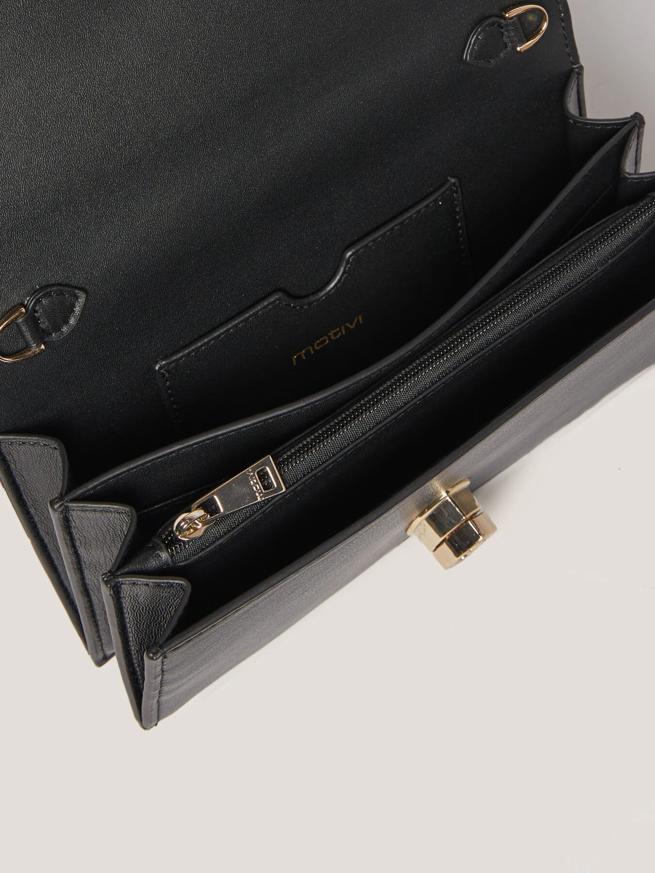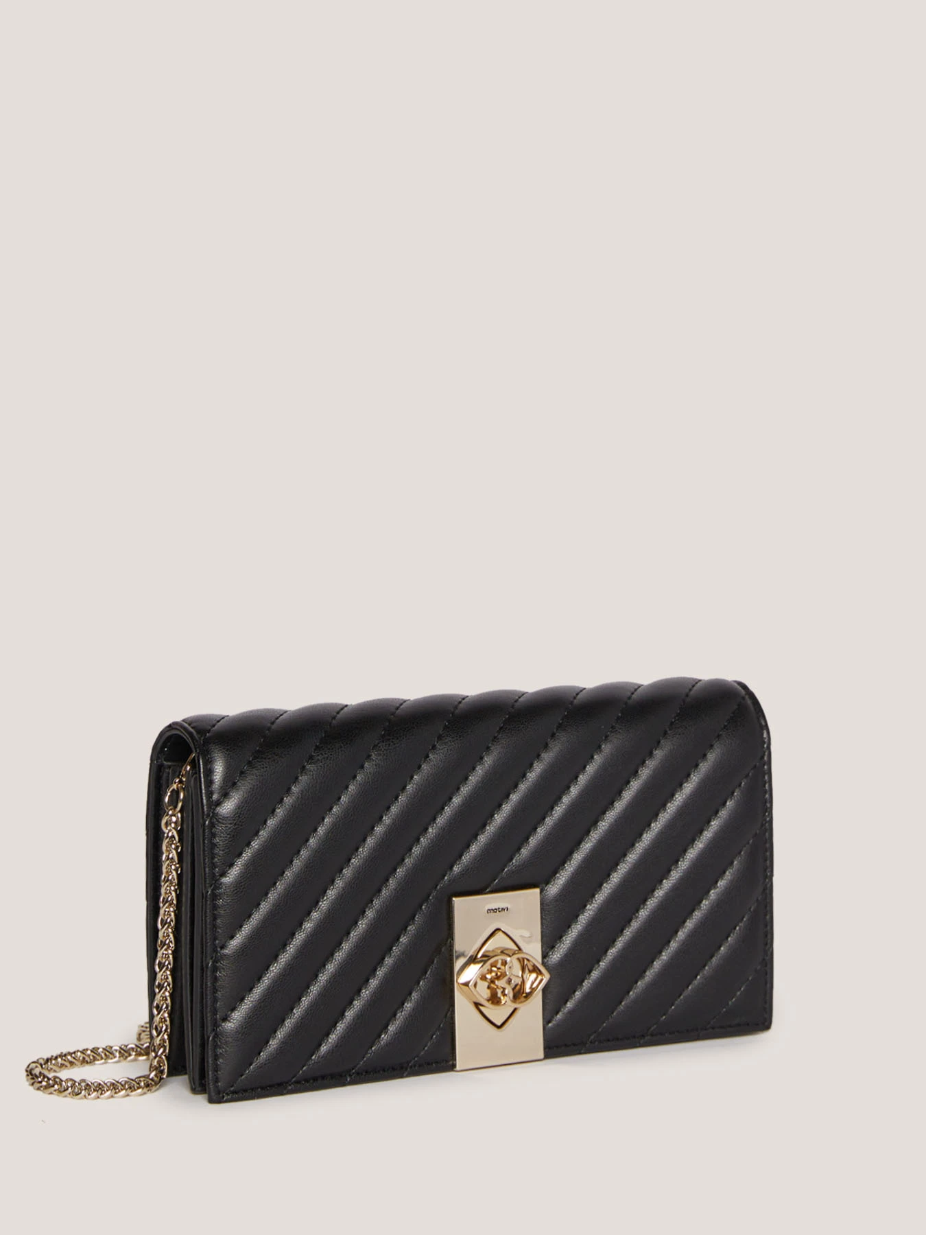 Wallet Bag in similpelle effetto quilted; chiusura con nottolino Double Love, tracolla in catena metallica, tasche interne; dimensioni: altezza 10 cm, larghezza 19 cm, ampiezza 4 cm.