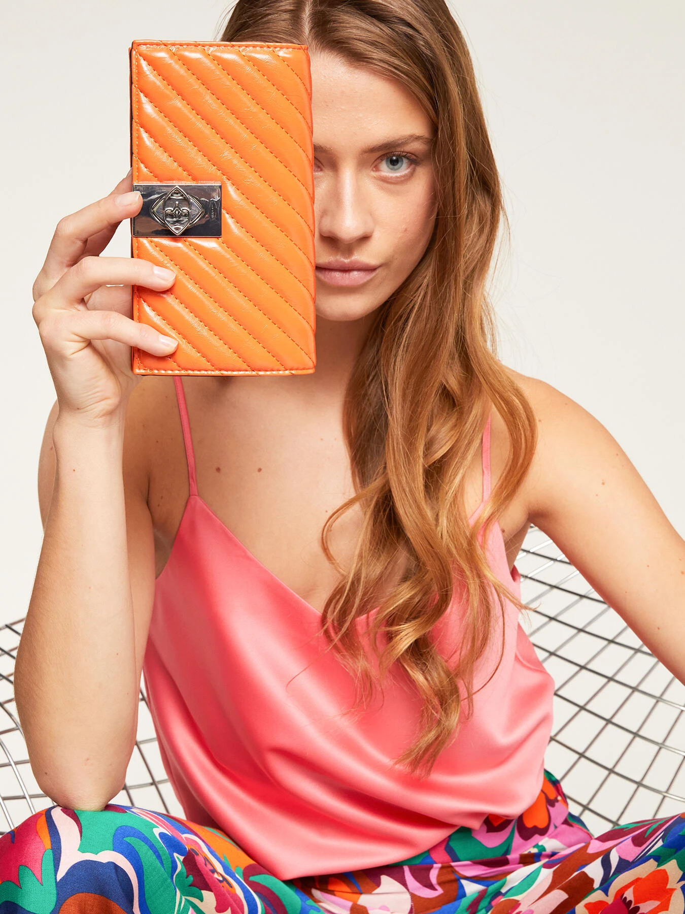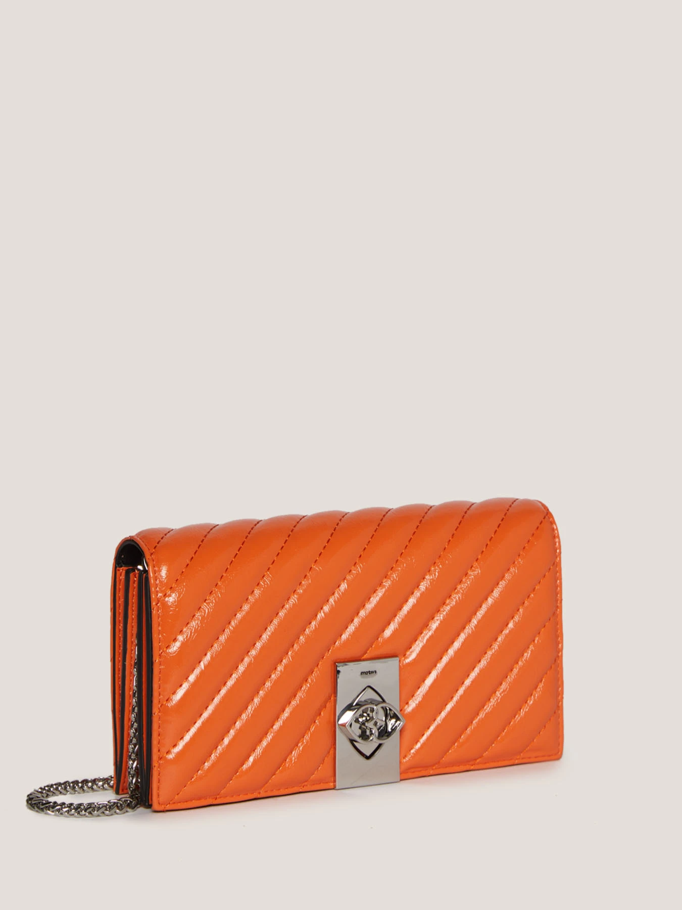 Wallet Bag in similpelle lucida effetto quilted; chiusura con nottolino Double Love, tracolla in catena metallica, tasche interne; dimensioni: altezza 10 cm, larghezza 19 cm, ampiezza 4 cm.