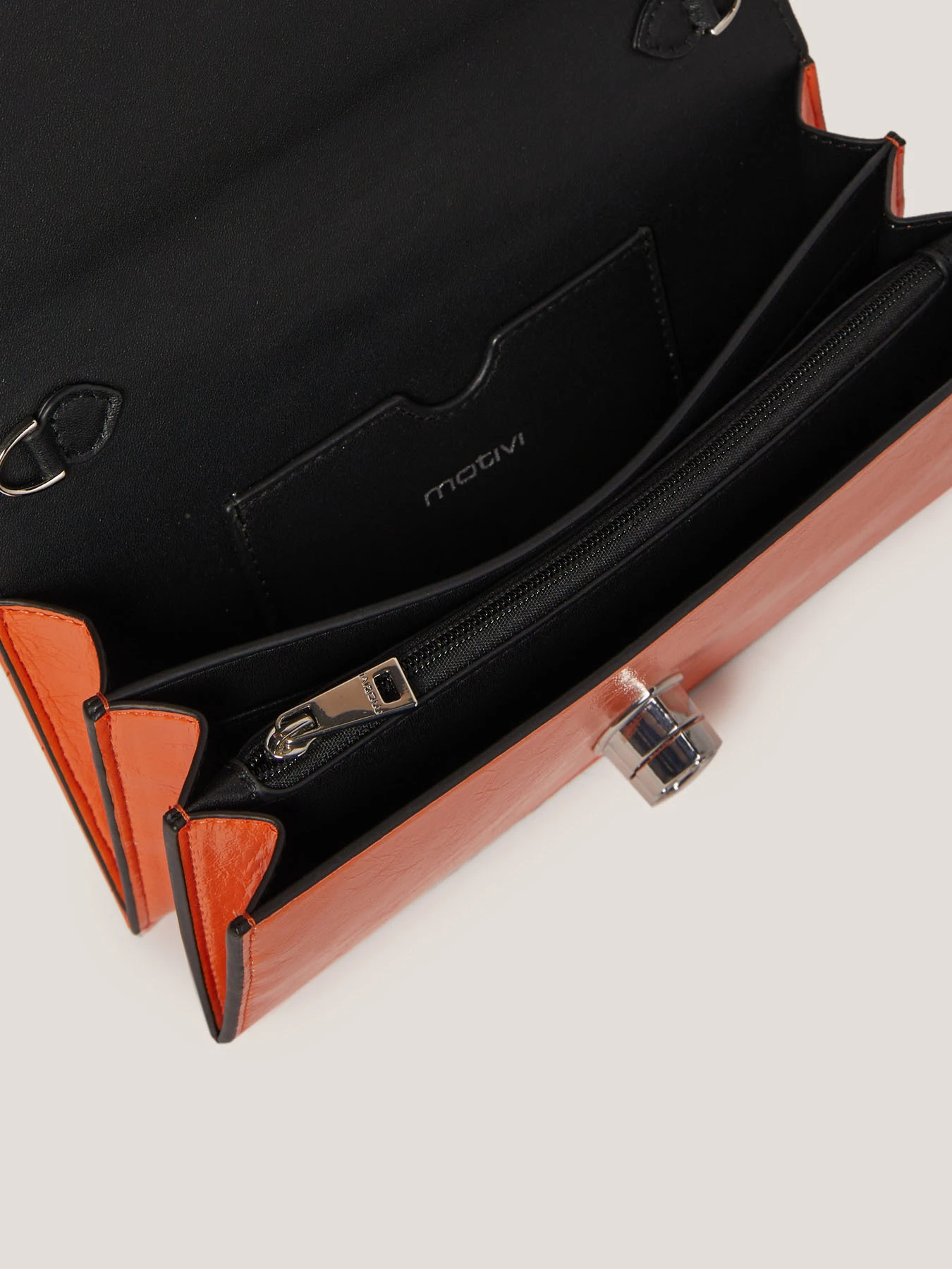 Wallet Bag in similpelle lucida effetto quilted; chiusura con nottolino Double Love, tracolla in catena metallica, tasche interne; dimensioni: altezza 10 cm, larghezza 19 cm, ampiezza 4 cm.